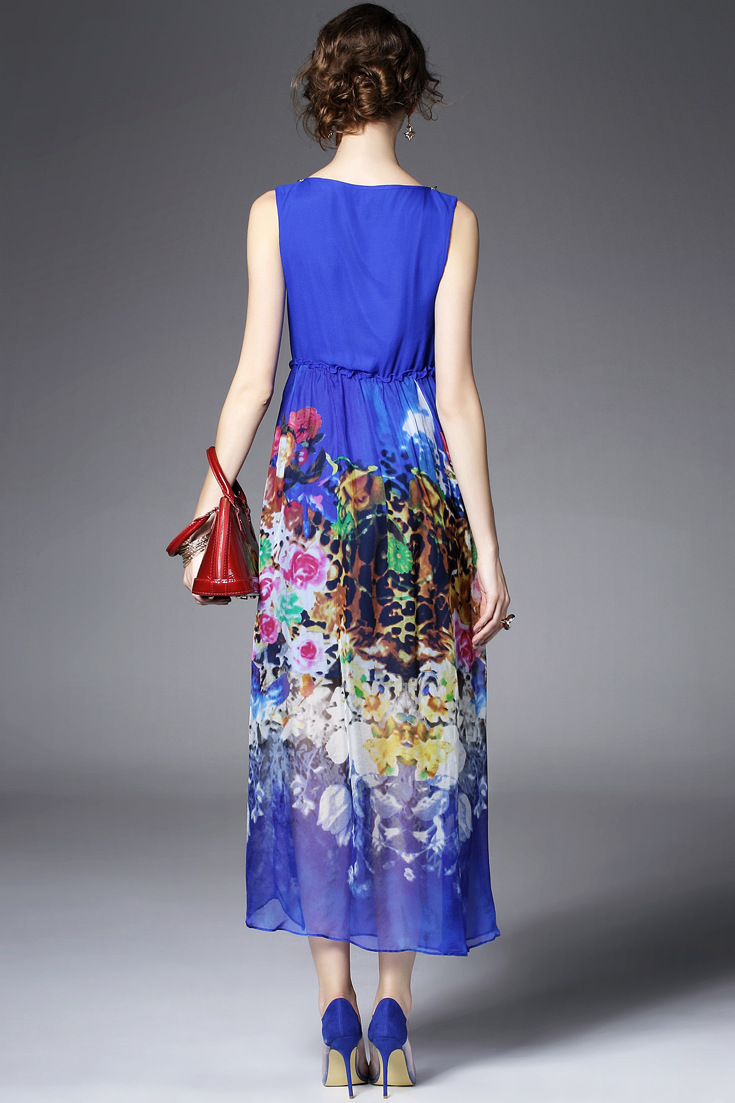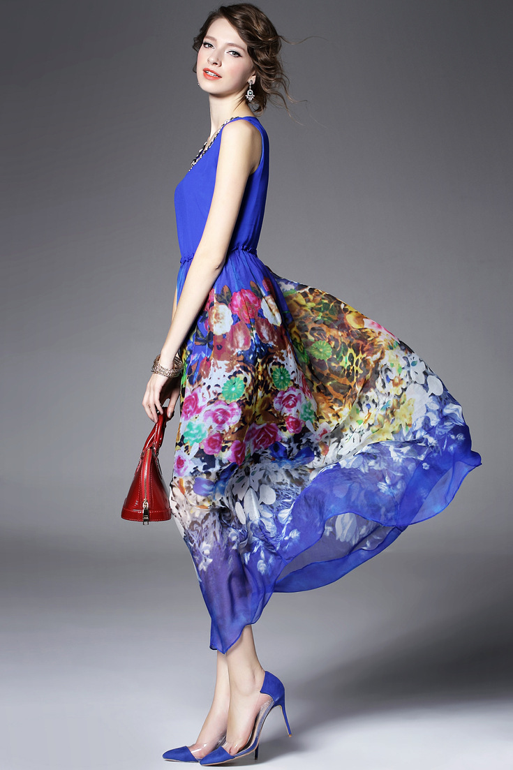 2015夏季新款 圆领无袖钉珠弹力收腰印花大摆真丝长裙