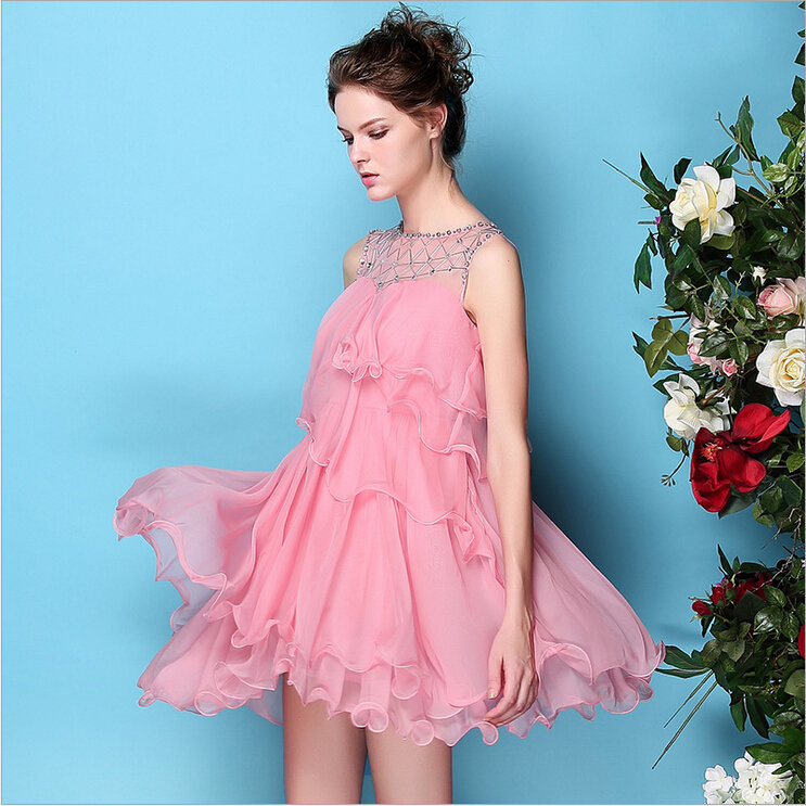 2015新款女装圆领无袖裙高腰百褶裙钉珠欧洲站雪纺连衣裙