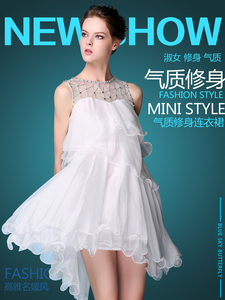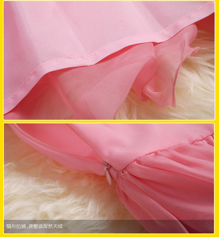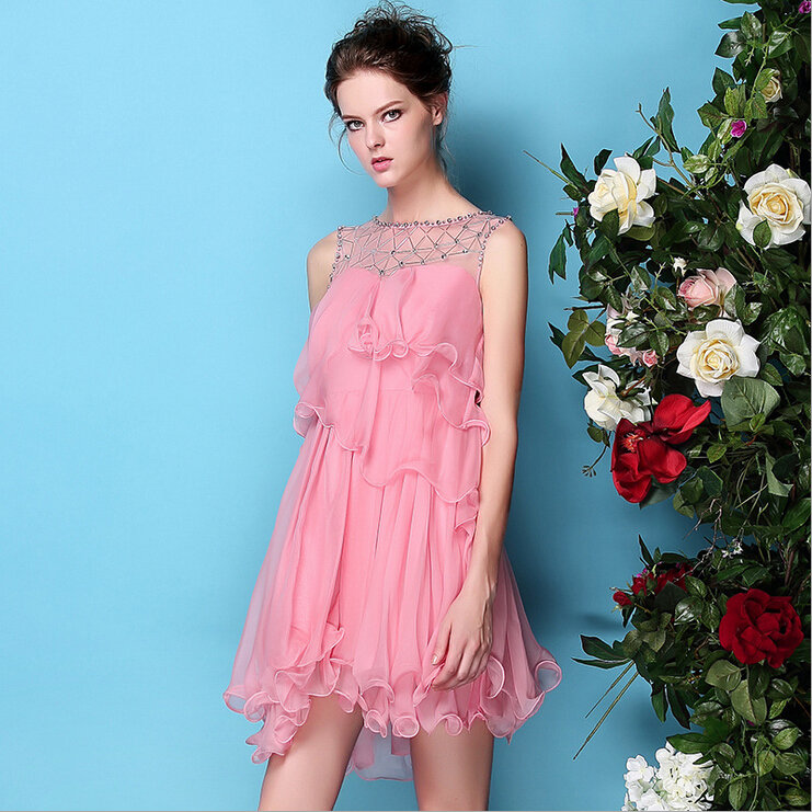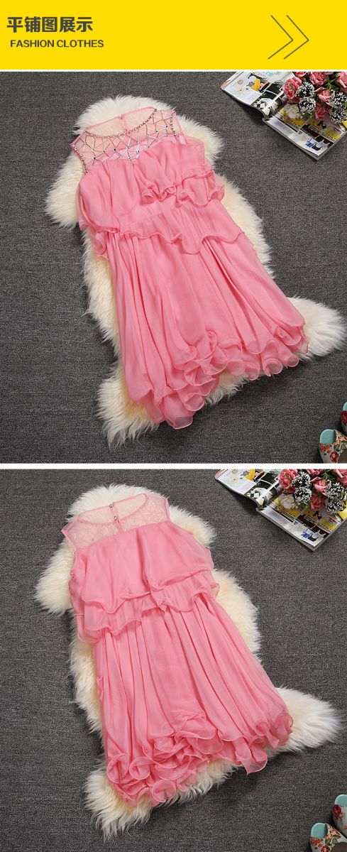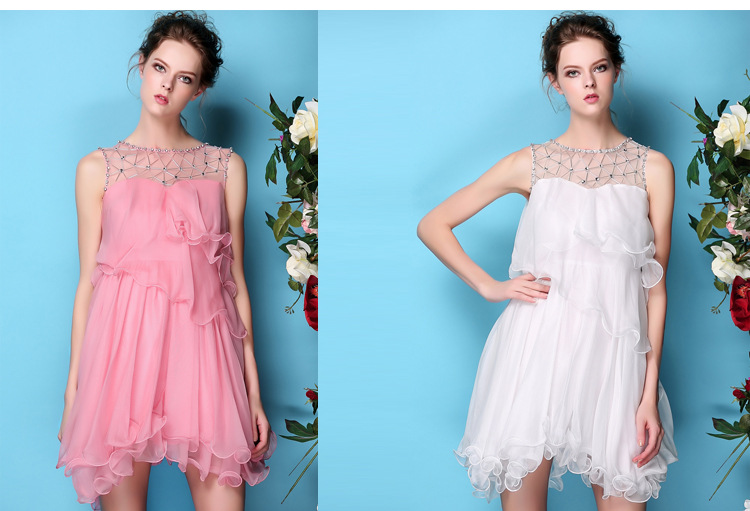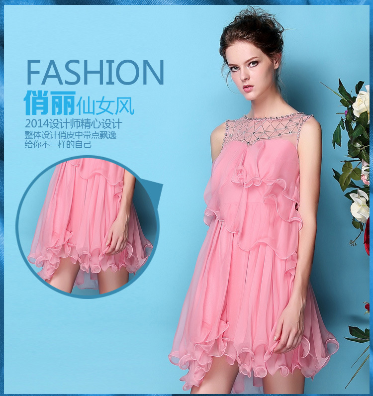 > 2015新款女装圆领无袖裙高腰百褶裙钉珠欧洲站雪纺连衣裙