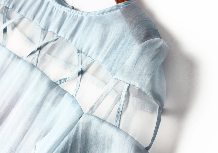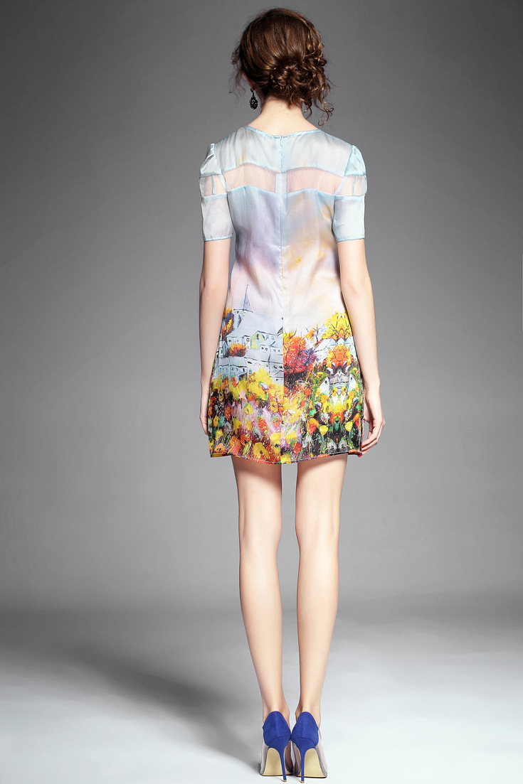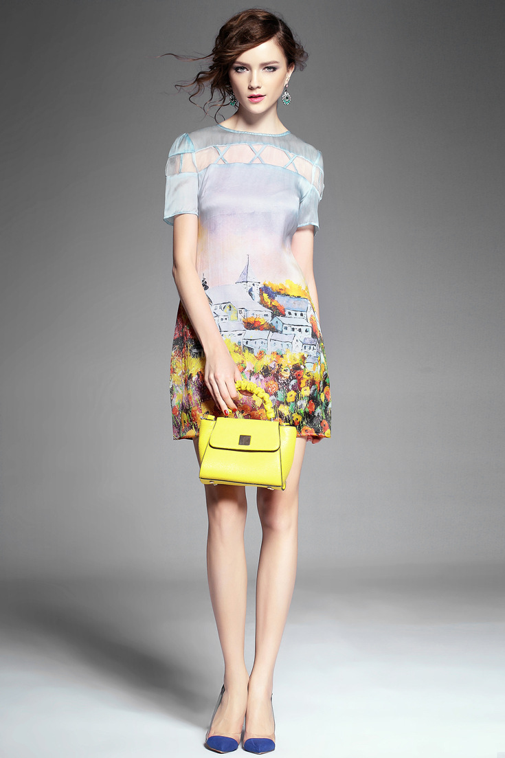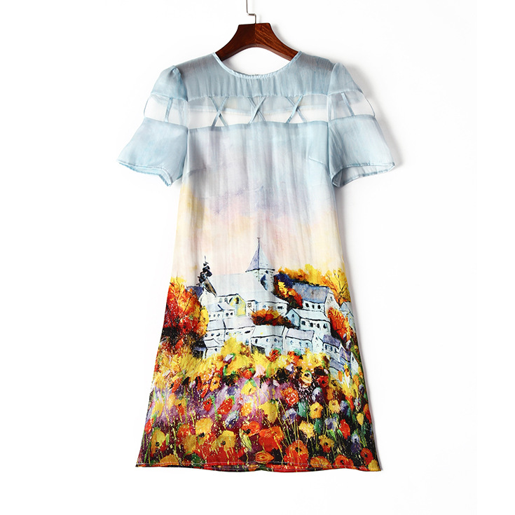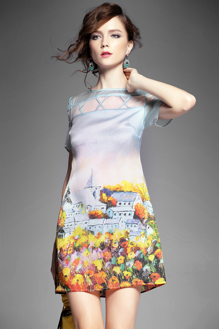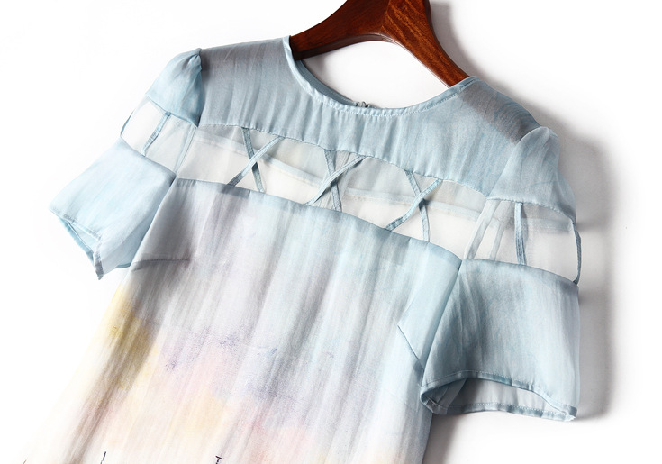 > 2015夏季新款 欧美高端圆领短袖拼接印花真丝欧根纱修身一步裙
