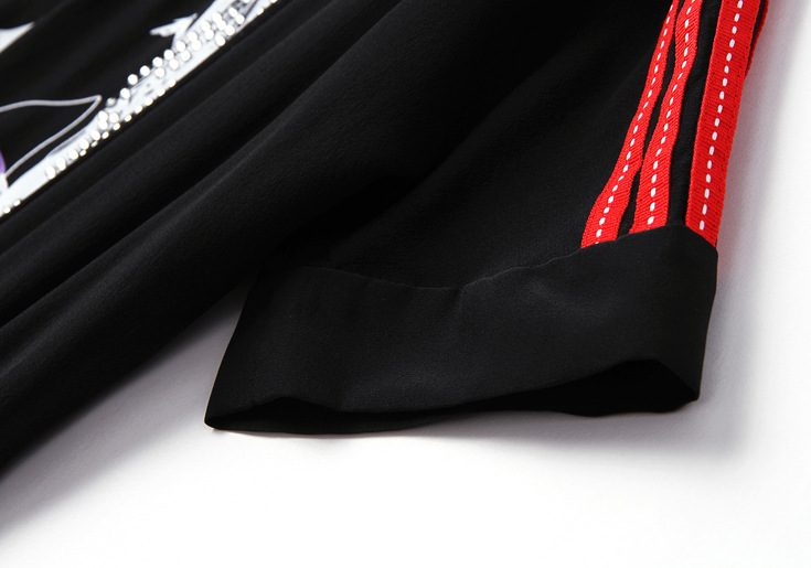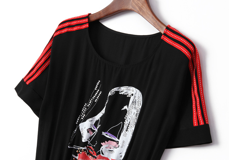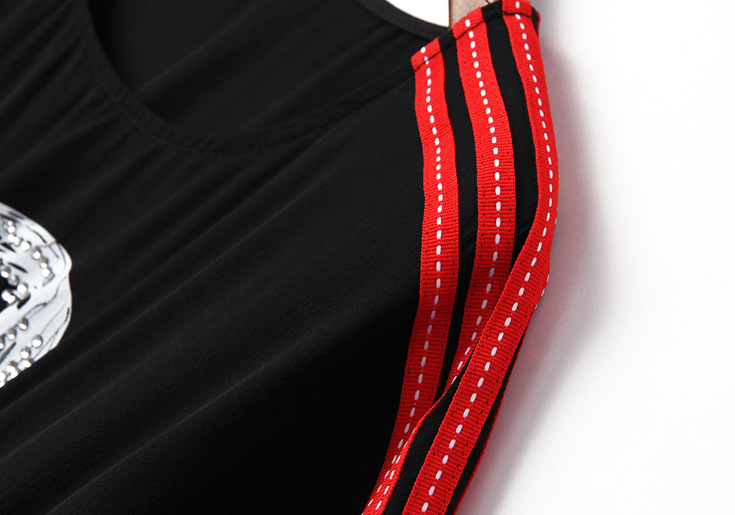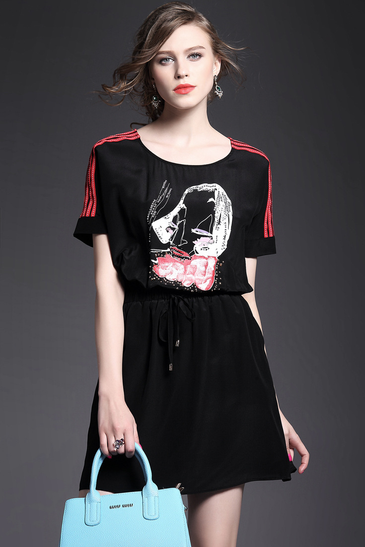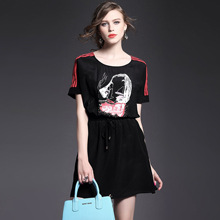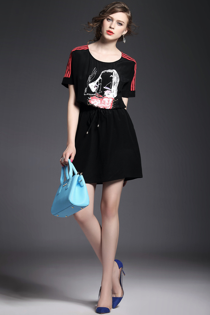 > 2015夏装新款 圆领织带拼接钉珠镶钻个性印花系带收腰真丝连衣裙
