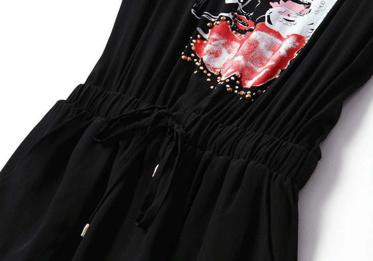 2015夏装新款 圆领织带拼接钉珠镶钻个性印花系带收腰真丝连衣裙