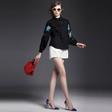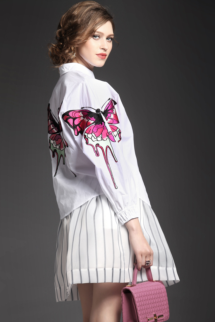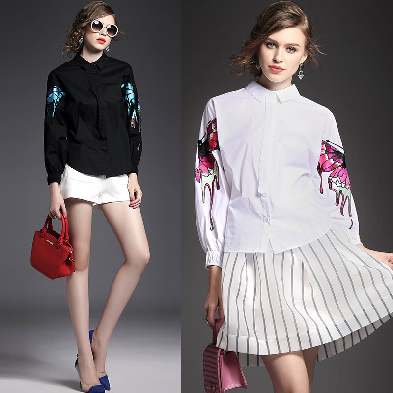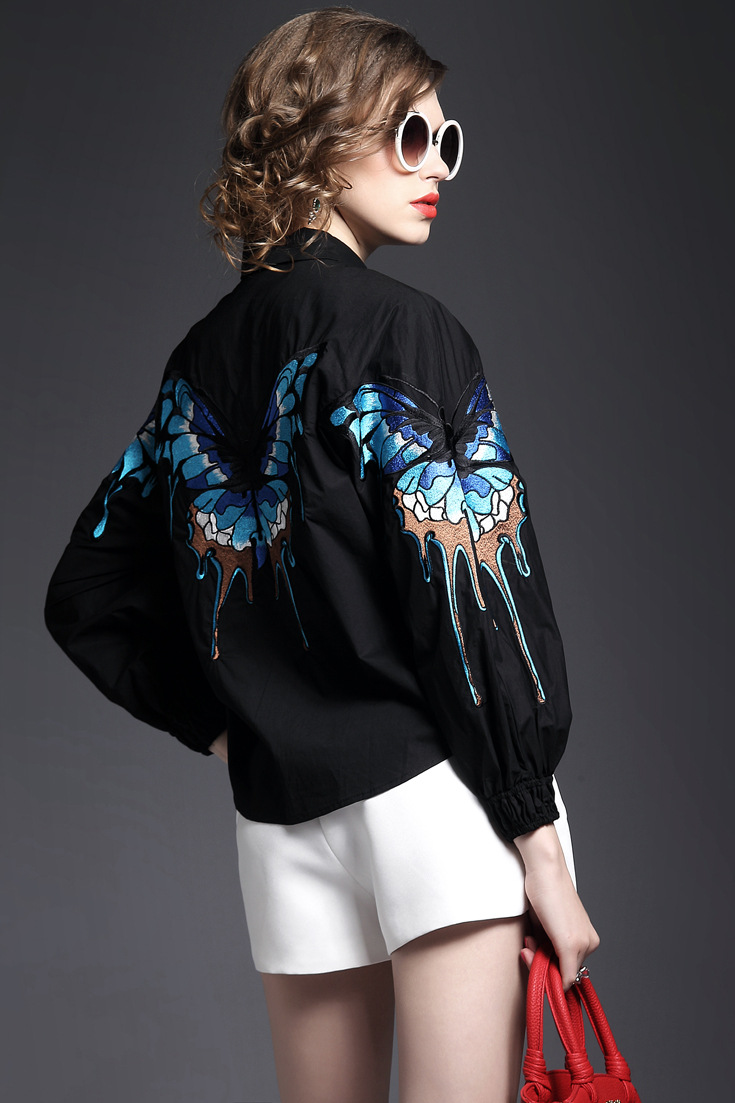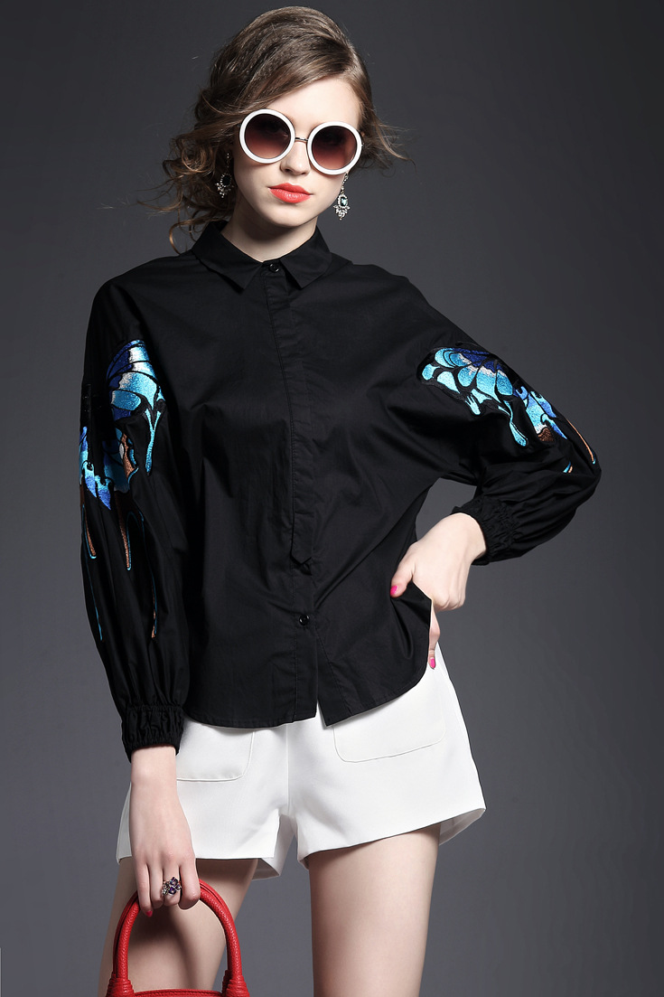 > 2015夏季新款 欧美翻领蝙蝠袖重工蝴蝶刺绣单排扣宽松衬衣女衬衫