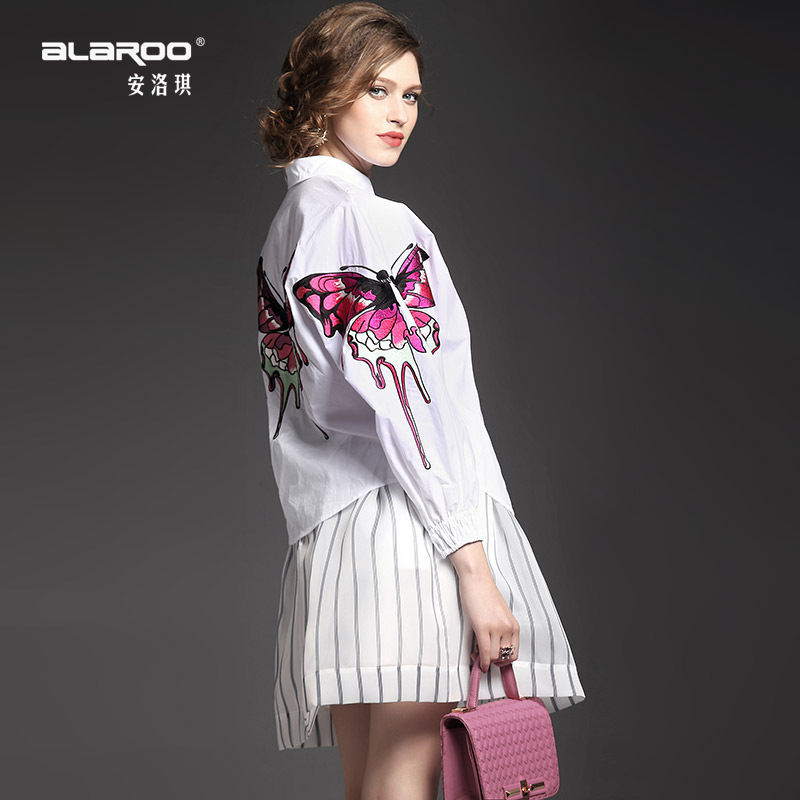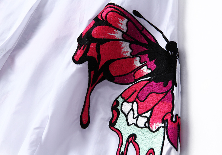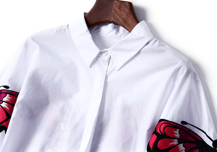 2015夏季新款 欧美翻领蝙蝠袖重工蝴蝶刺绣单排扣宽松衬衣女衬衫