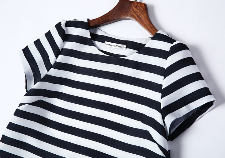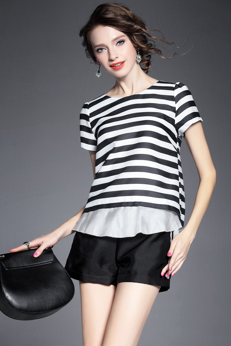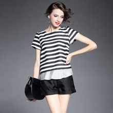 > 2015夏 欧美时尚不规则后背开叉真丝拼接条纹上衣+阔腿短裤套装