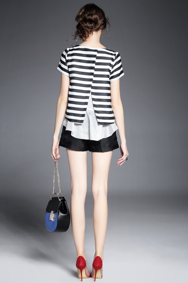 2015夏 欧美时尚不规则后背开叉真丝拼接条纹上衣+阔腿短裤套装