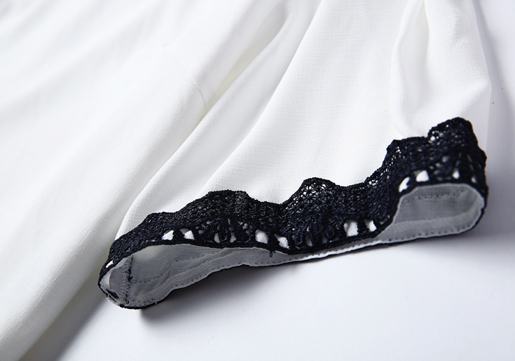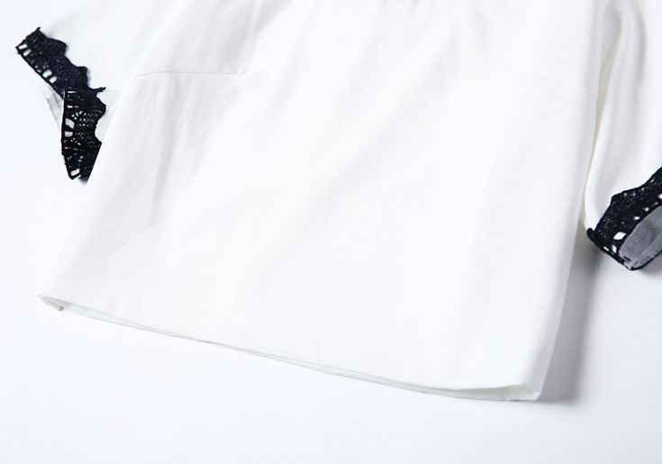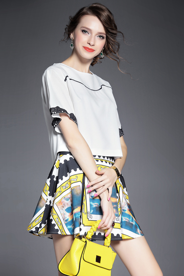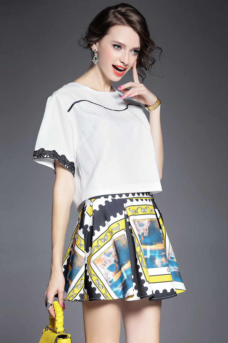 2015夏季女装 欧美大牌袖口蕾丝拼贴短袖T恤+印花半裙两件套