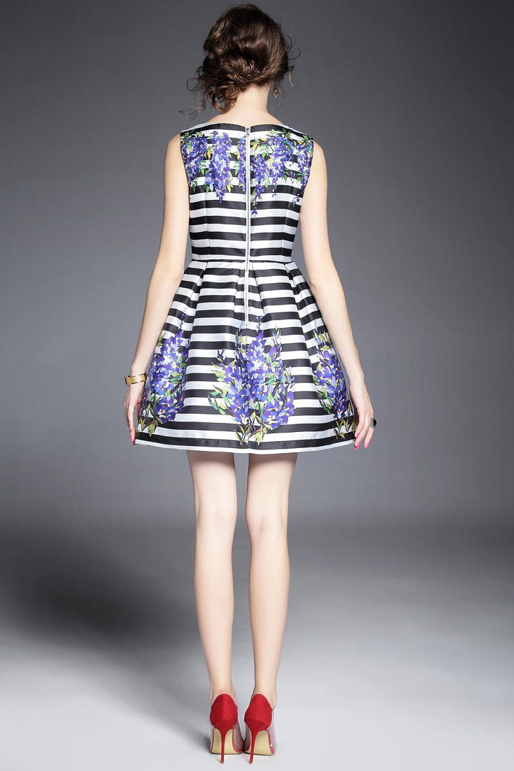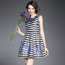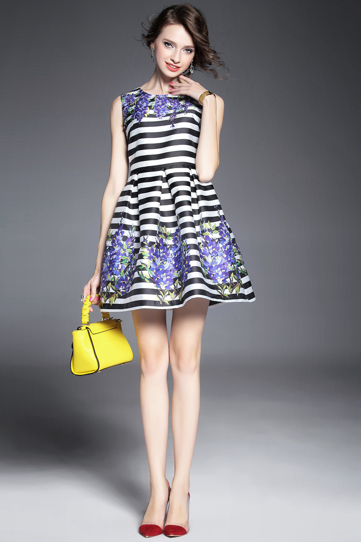 2015夏季新款 圆领钉珠亮片条纹印花显瘦修身a字裙
