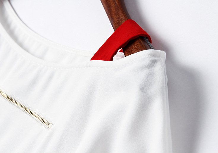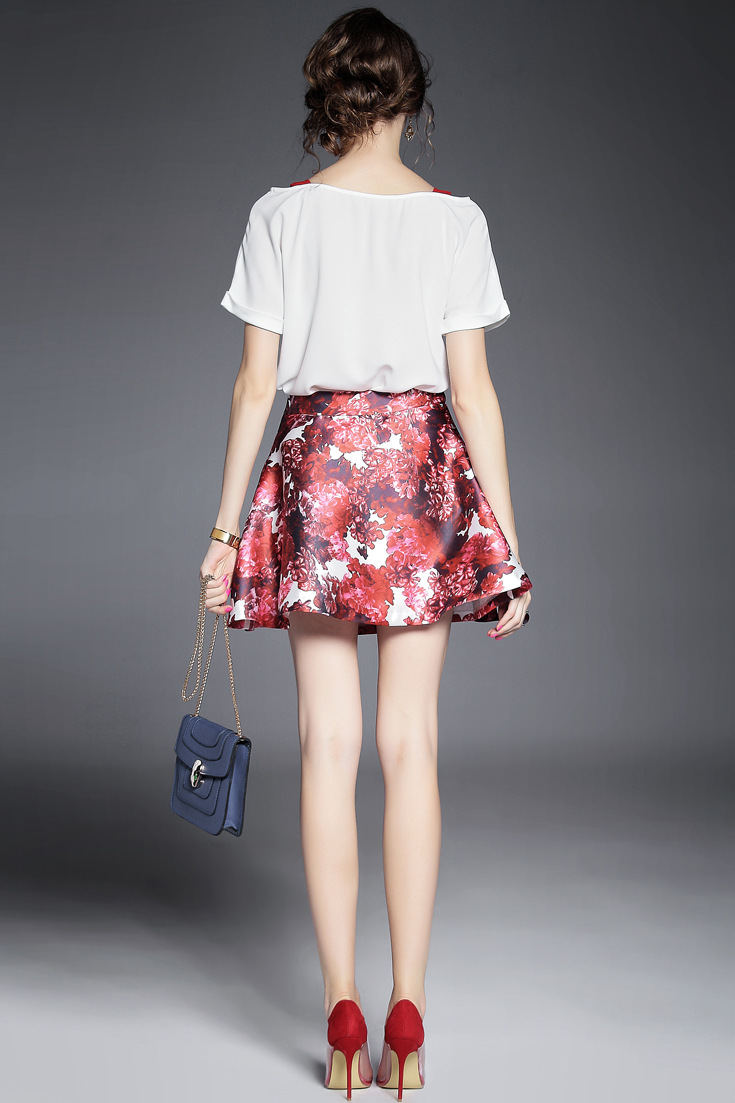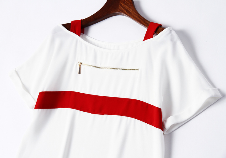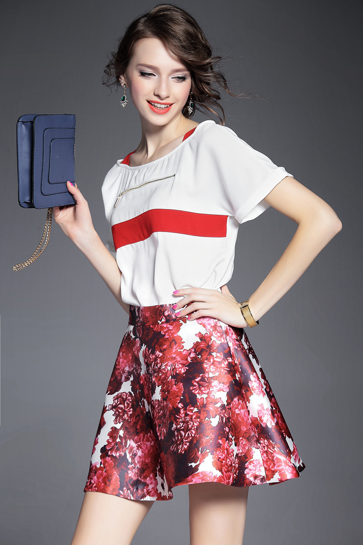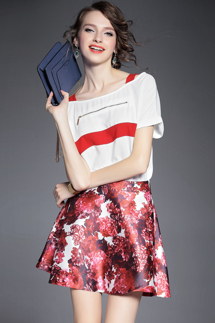 > 2015夏季新款女装 时尚红白撞色一字拉链肩带上衣+印花半裙套装
