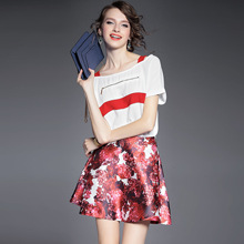 2015夏季女装 欧美大牌袖口蕾丝拼贴短袖T恤+印花半裙两件套