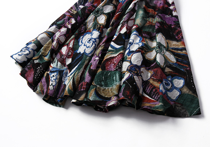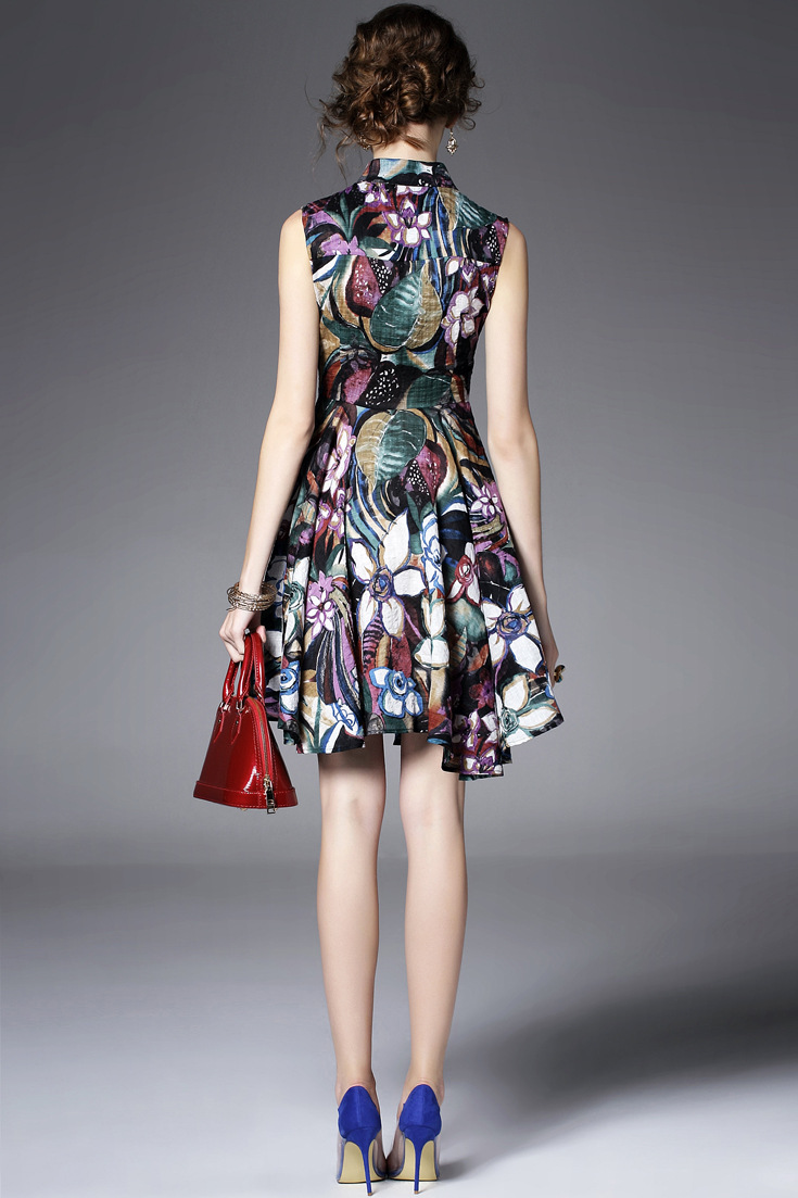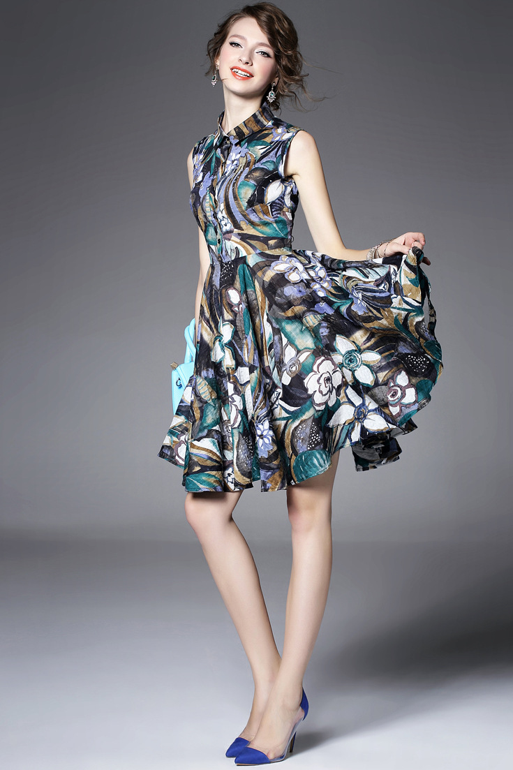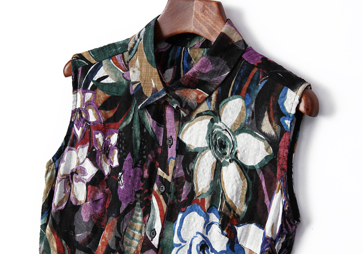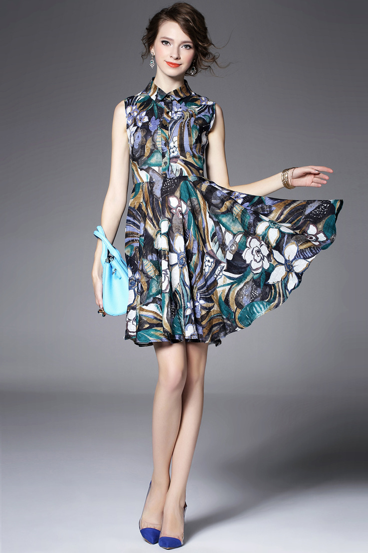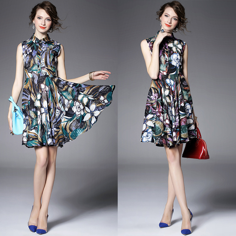 2015夏季新款 欧美大牌翻领无袖印花修身大摆a字裙纯麻连衣裙