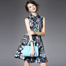 > 2015夏季新款 欧美大牌翻领无袖印花修身大摆a字裙纯麻连衣裙
