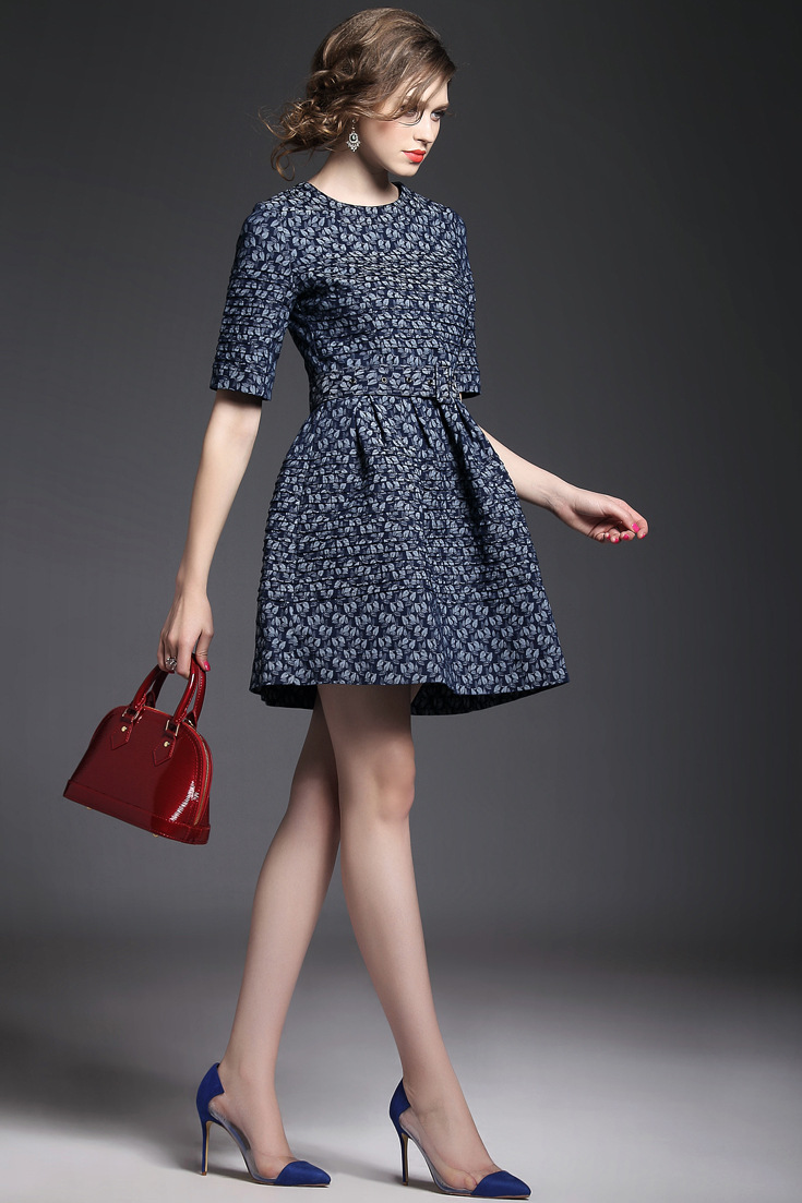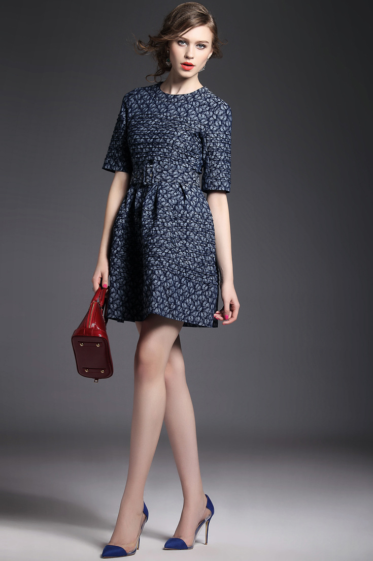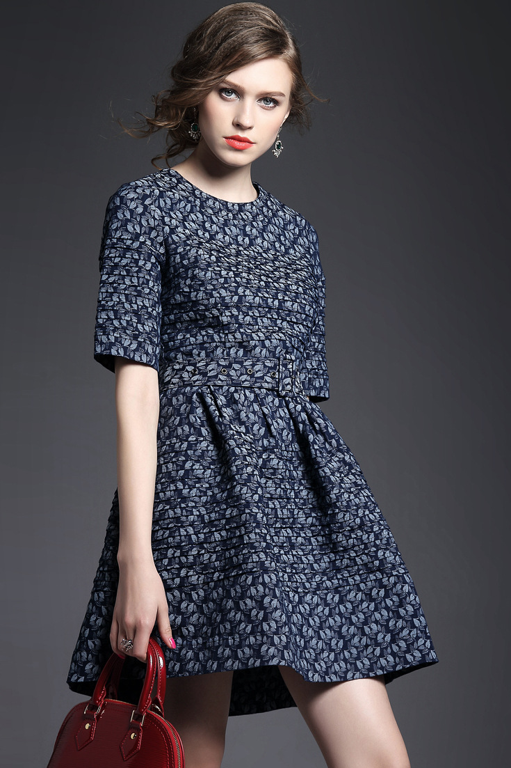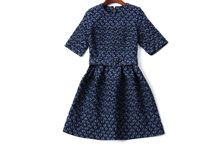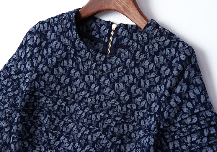 > 2015夏季女装新款 欧美大牌重工压褶树叶提花拼接束腰修身a字裙