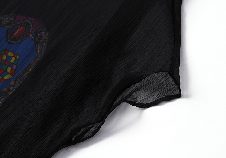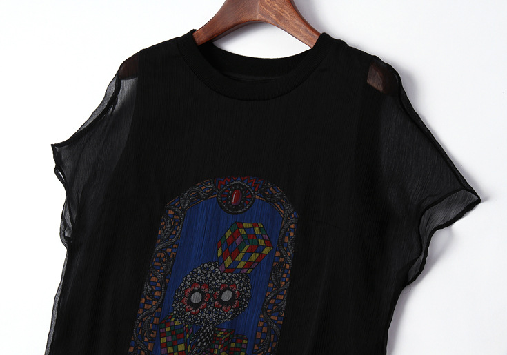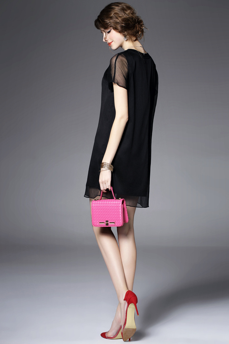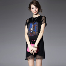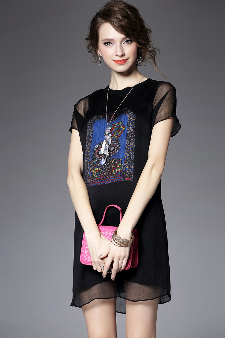 > 2015品牌女装夏季新款 欧美大牌圆领短袖印花拼贴真丝修身一步裙