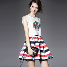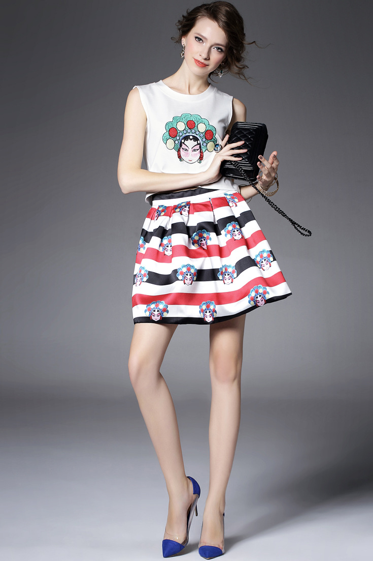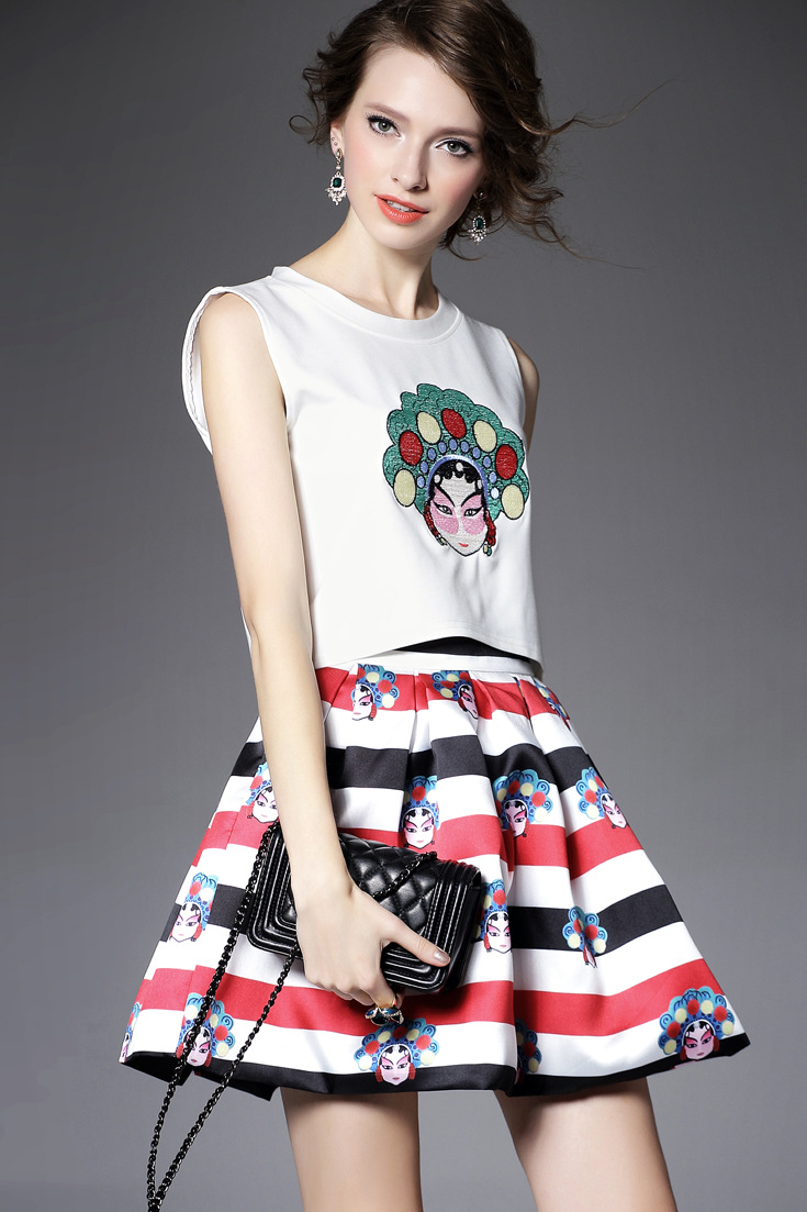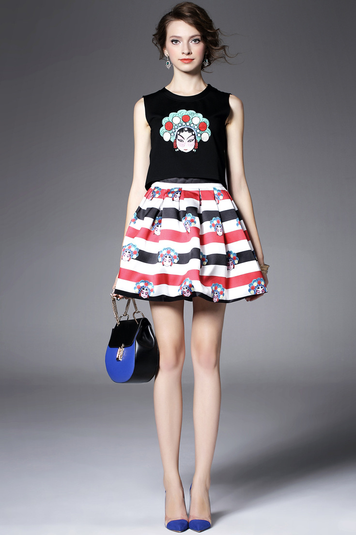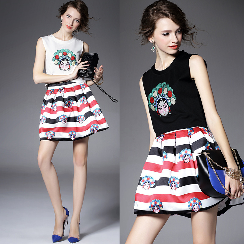 > 2015夏季女装 中国风京剧脸谱刺绣无袖短T恤+撞色条纹修身半裙