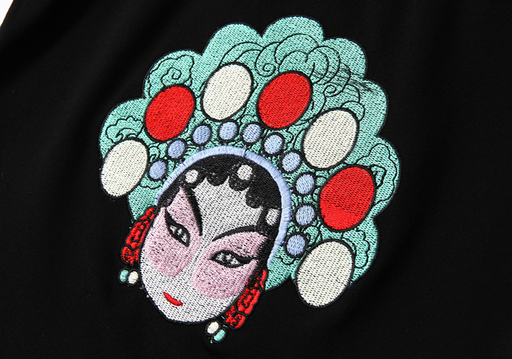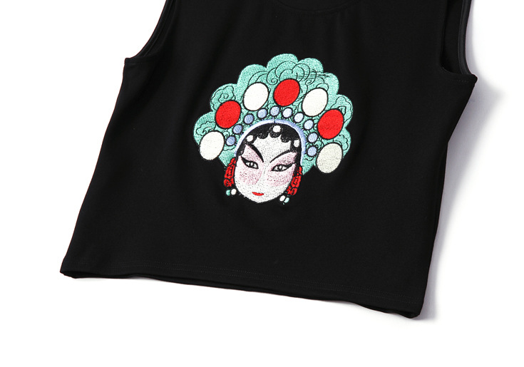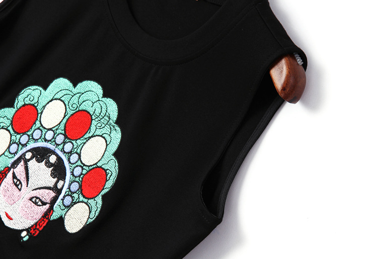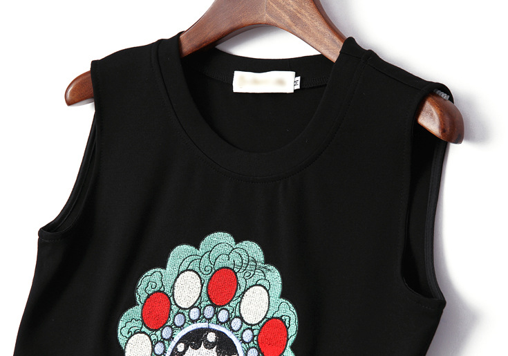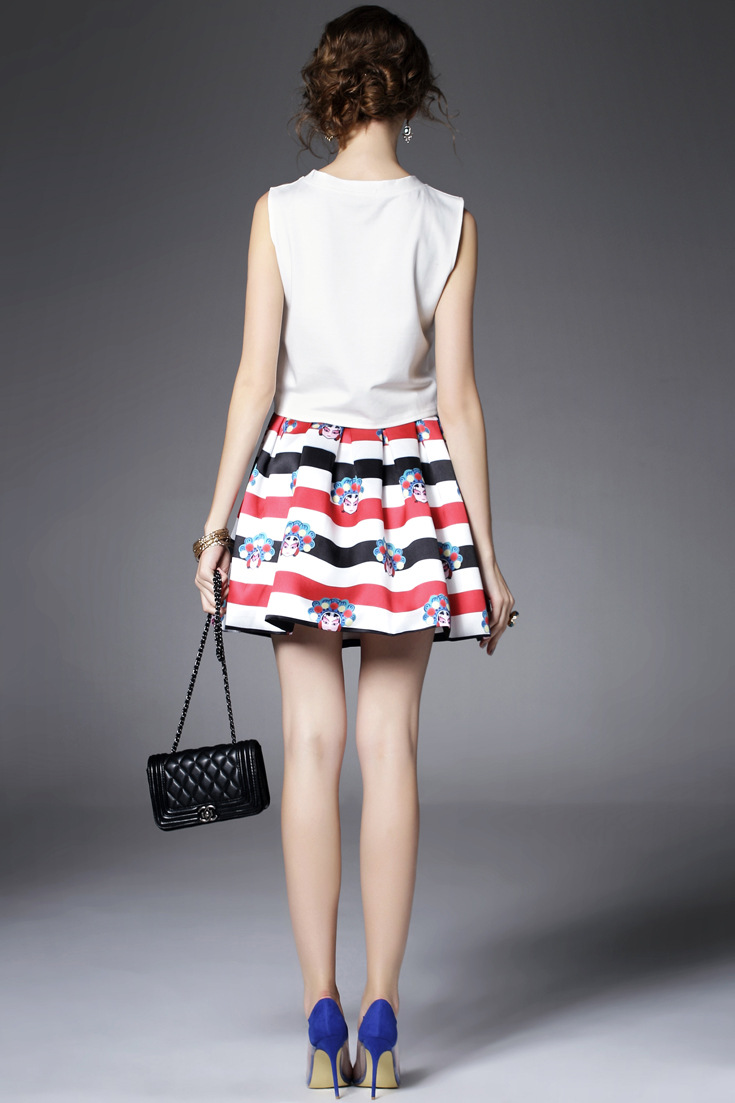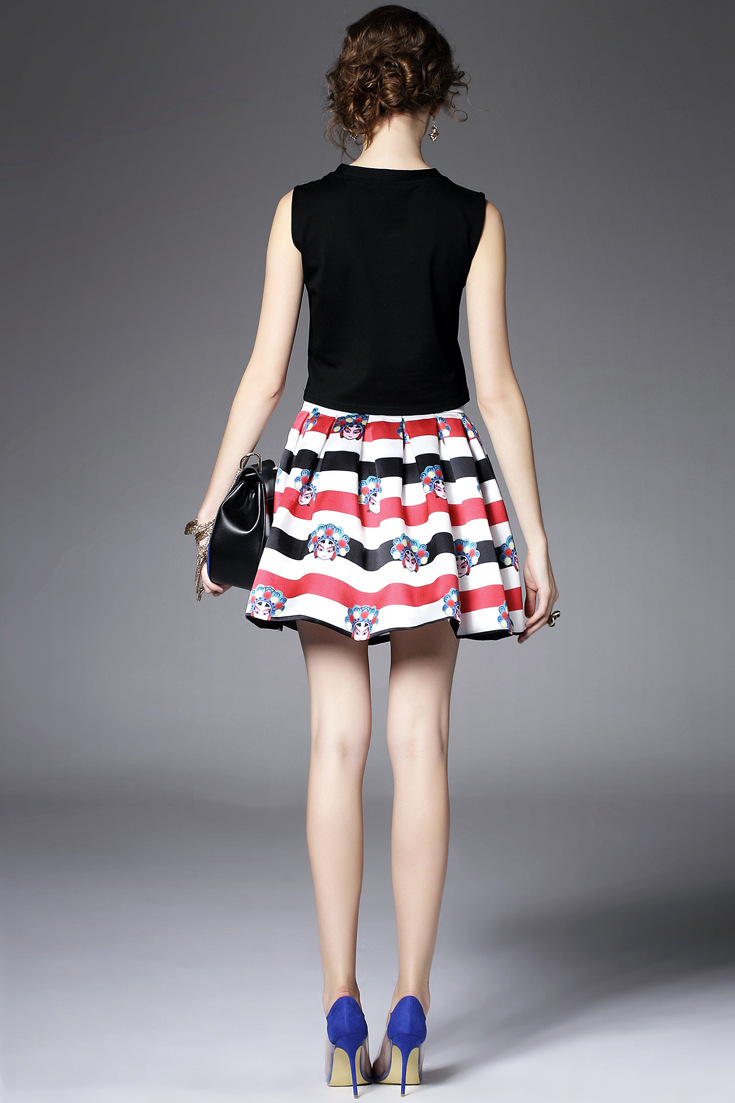 > 2015夏季女装 中国风京剧脸谱刺绣无袖短T恤+撞色条纹修身半裙