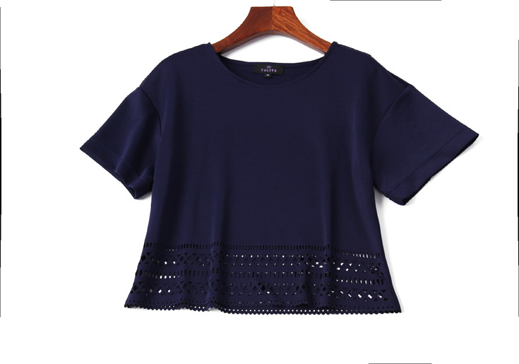 > 2015夏 圆领短袖钩花镂空纯色短上衣+条纹气质欧根纱半裙两件套女
