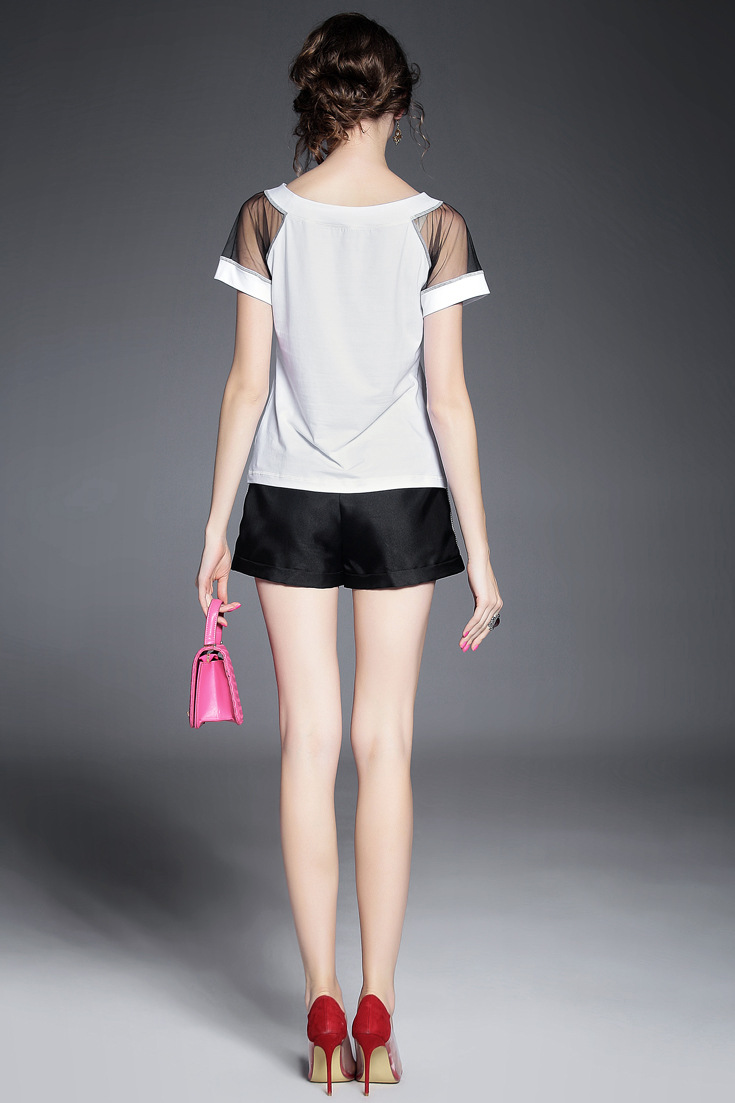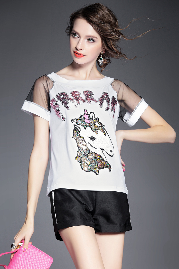 > 2015夏季女装 欧美时尚字母亮片绣花欧根纱拼接套头短袖纯棉T恤