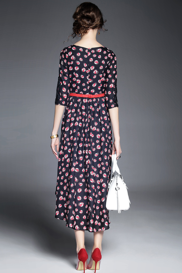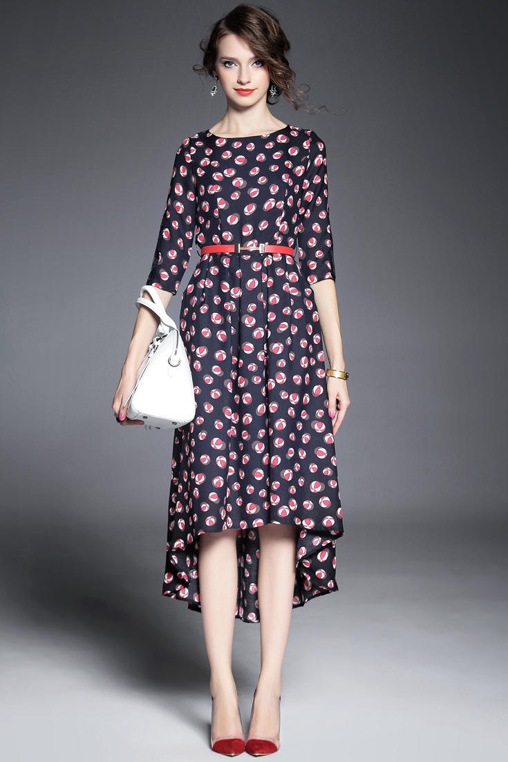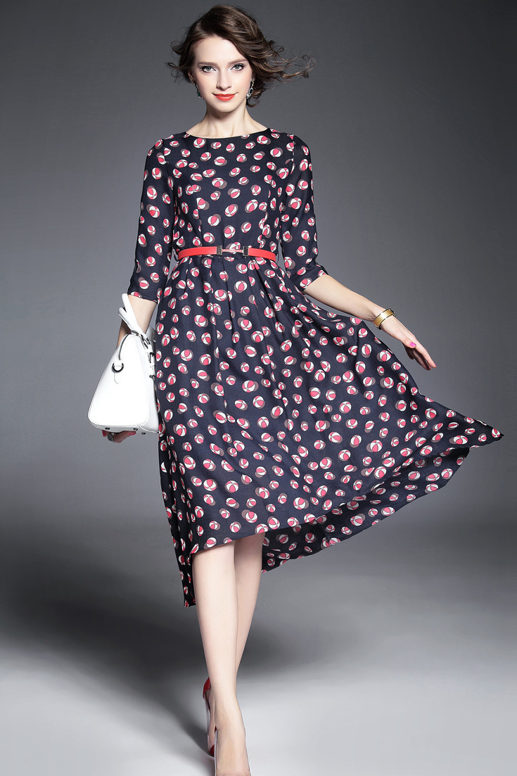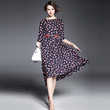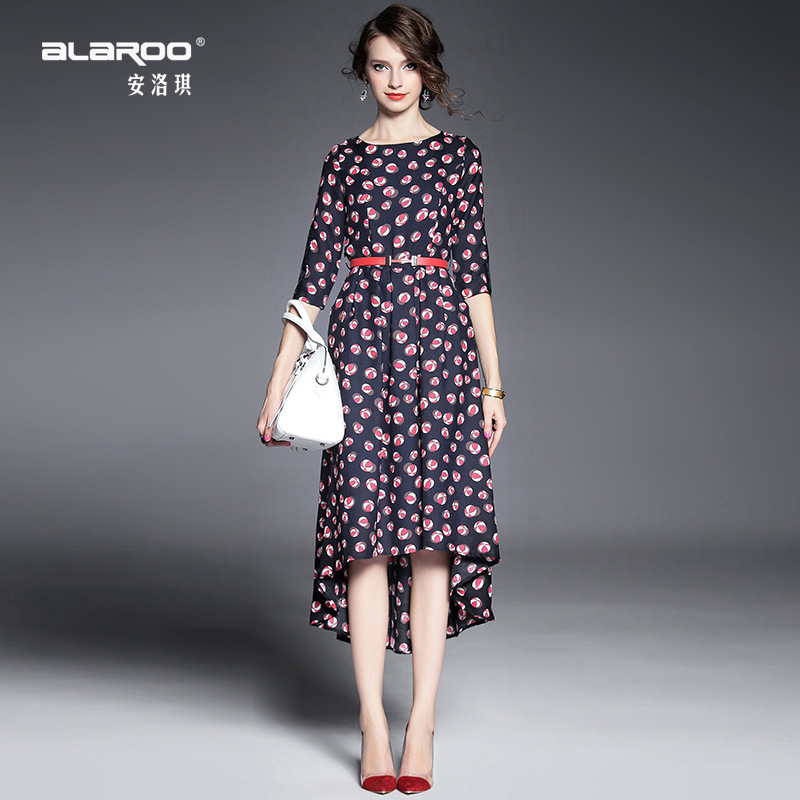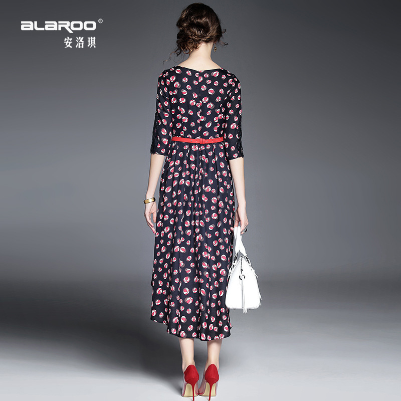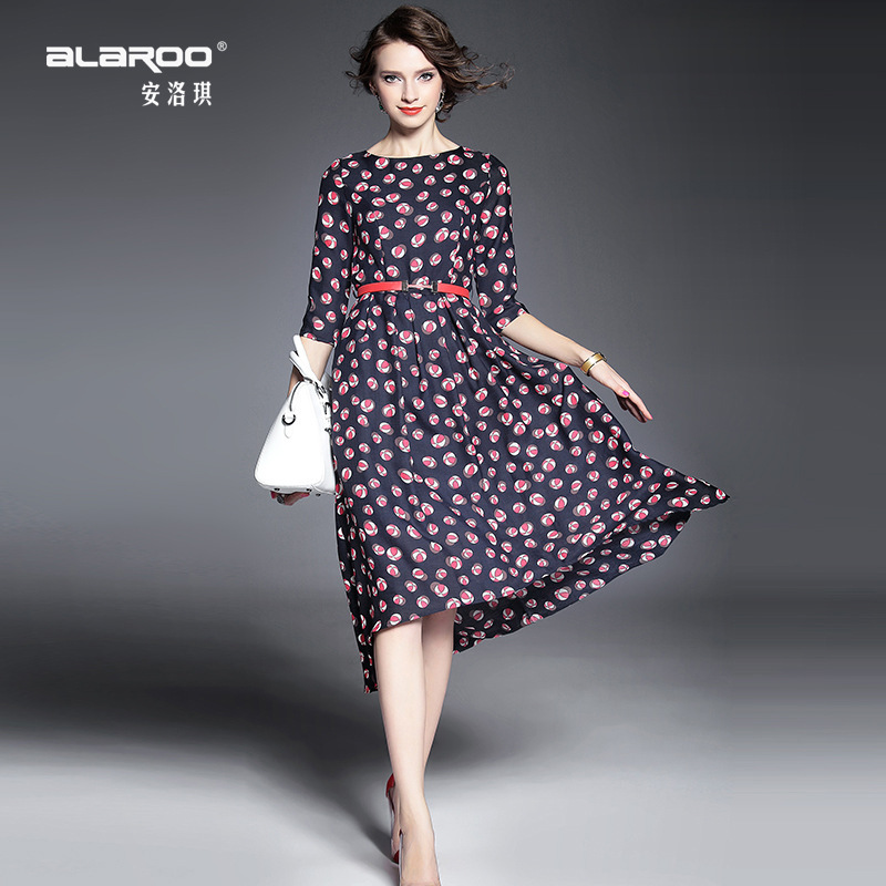 2015春夏新款欧美风印花高档桑蚕丝七分袖A字裙真丝连衣裙
