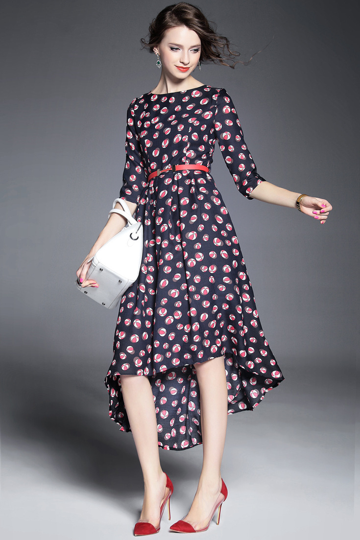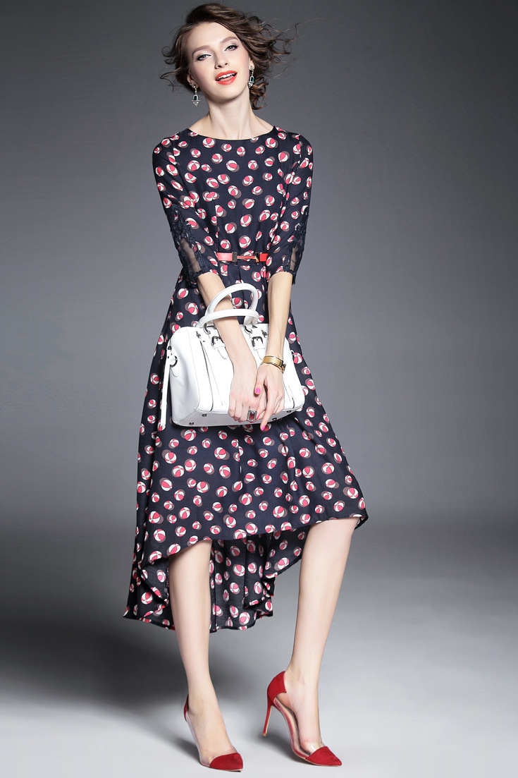 > 2015夏季新款圆领袖口绣花拼接印花不规则大摆中长连衣裙