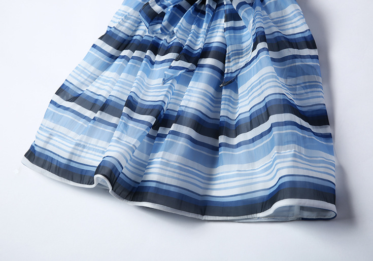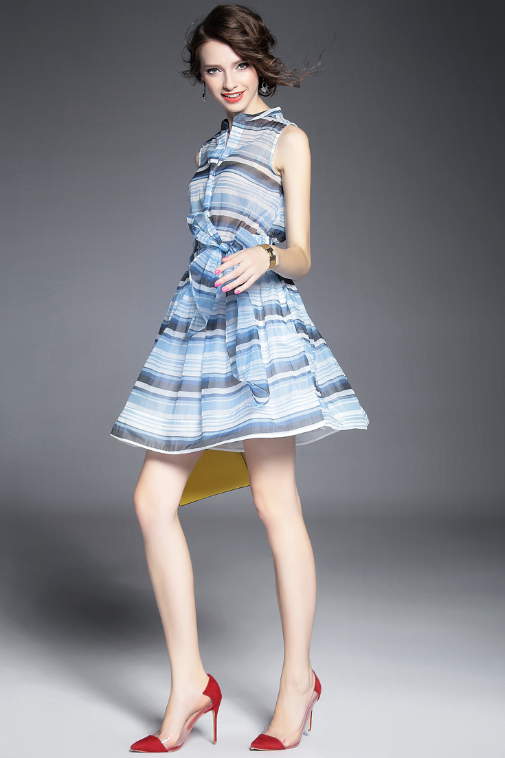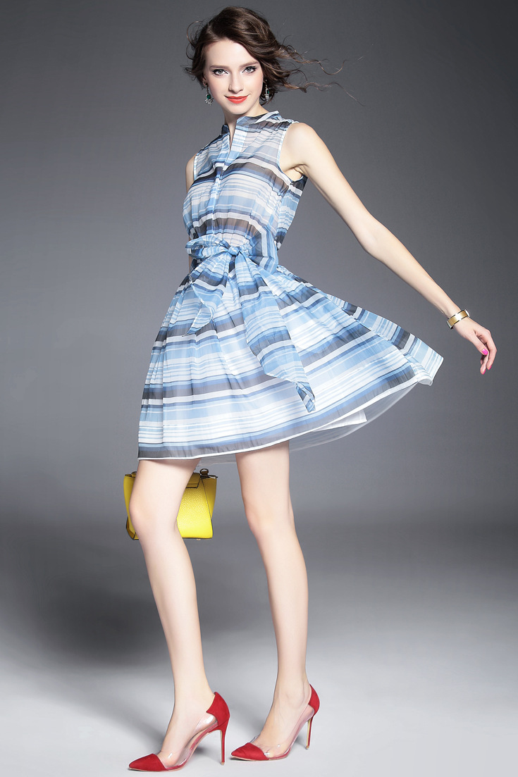 > 2015夏装新款 欧美立领无袖撞色条纹弹力收腰压褶系带修身a字裙