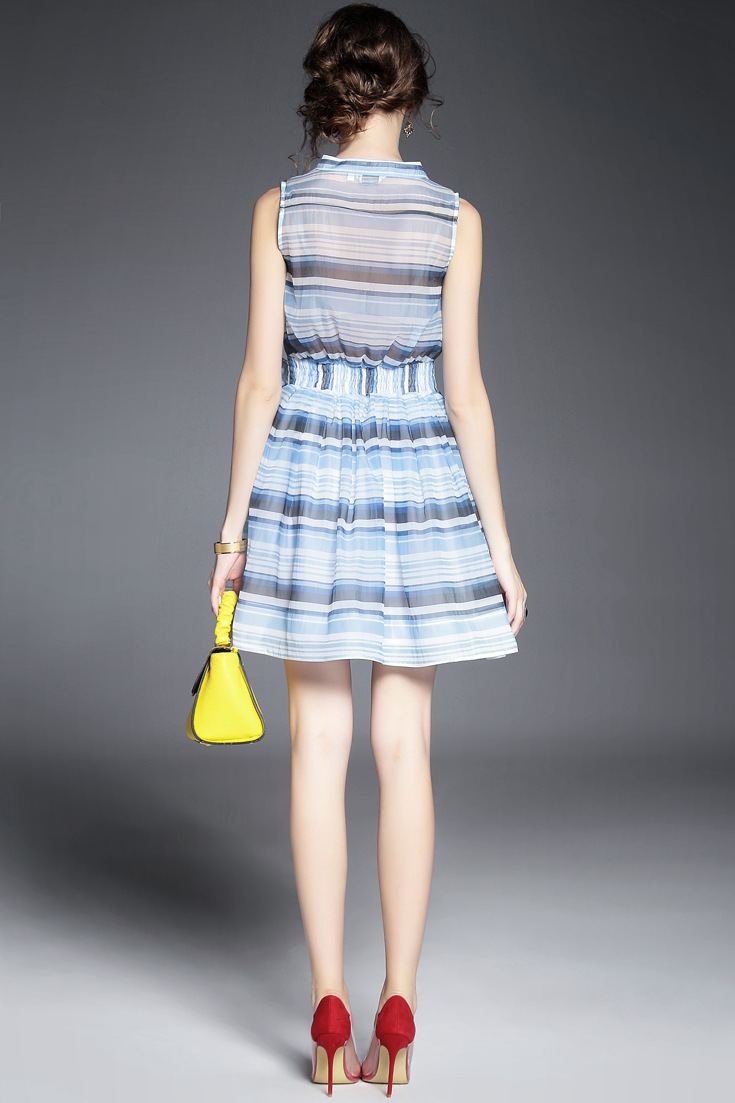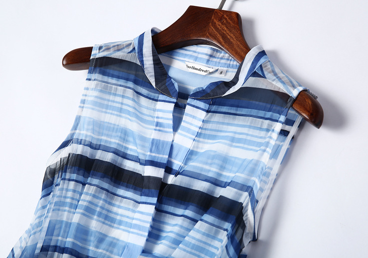 2015夏装新款 欧美立领无袖撞色条纹弹力收腰压褶系带修身a字裙