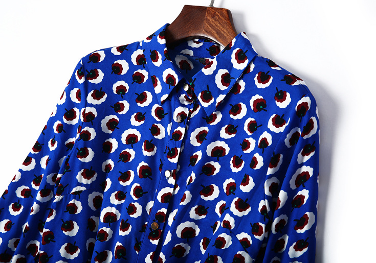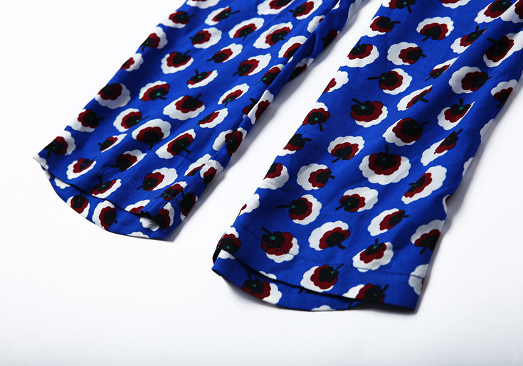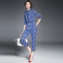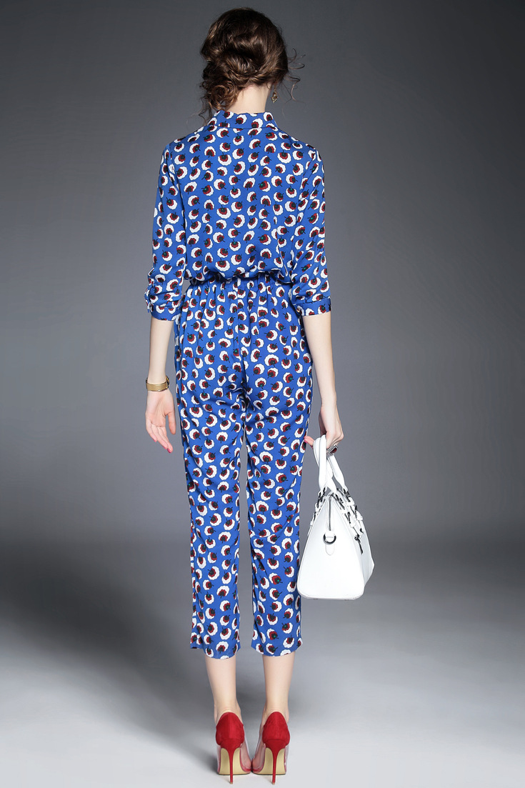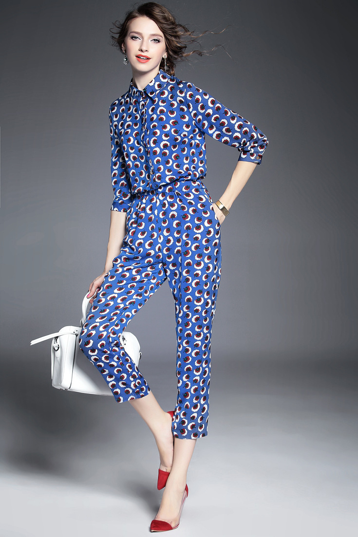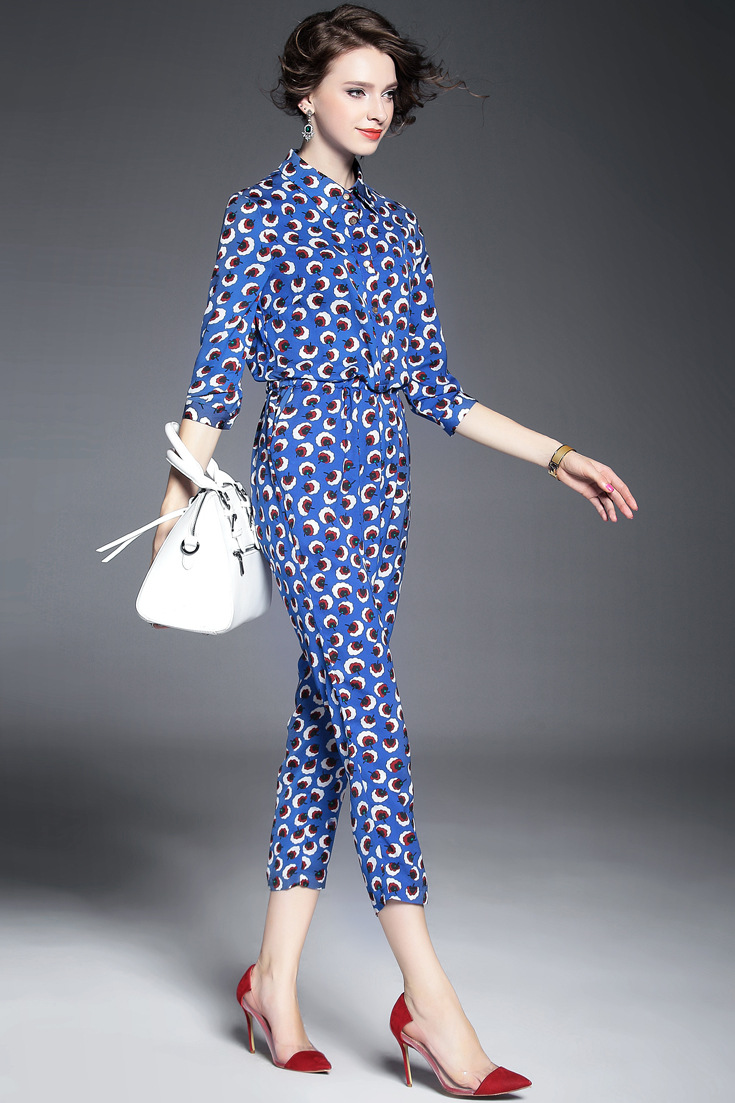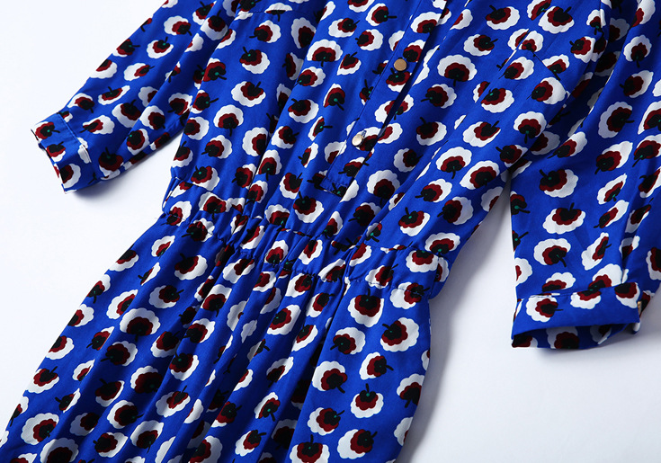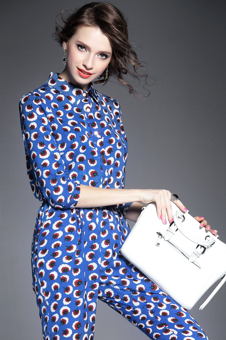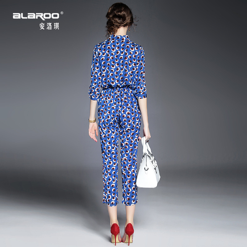 2105夏 欧美大牌翻领单排扣蒲公英印花弹力收腰修身连体长裙裤