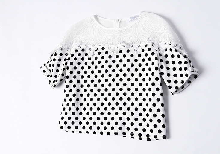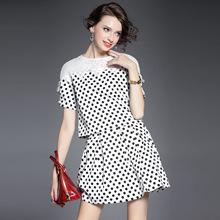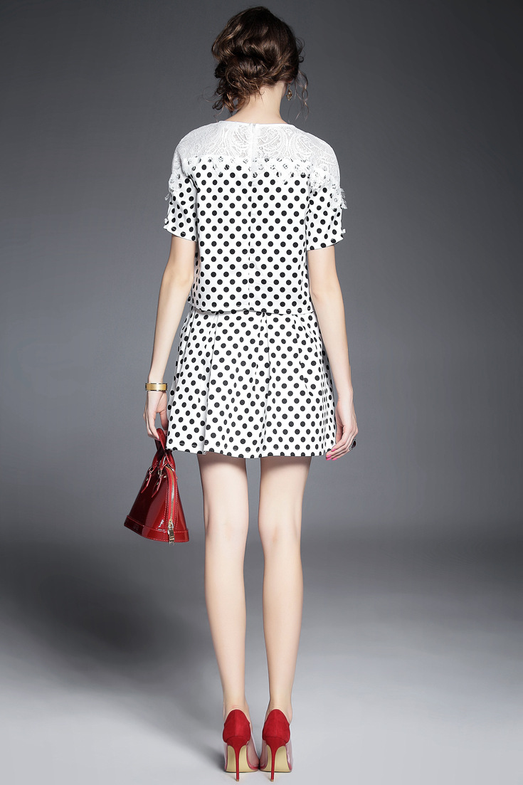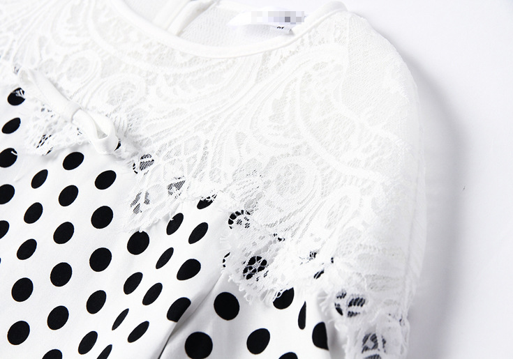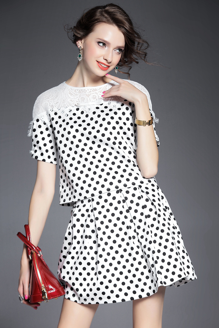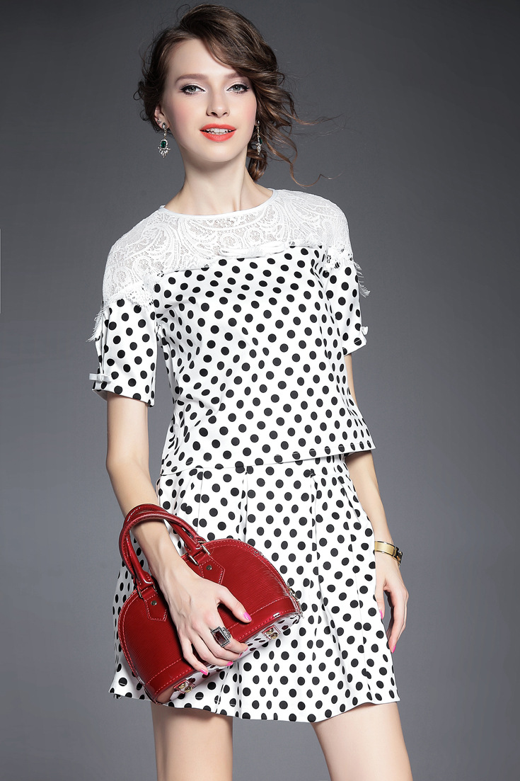 2015夏新款 圆领蕾丝拼接袖口蝴蝶结棉T恤+波点半裙套装