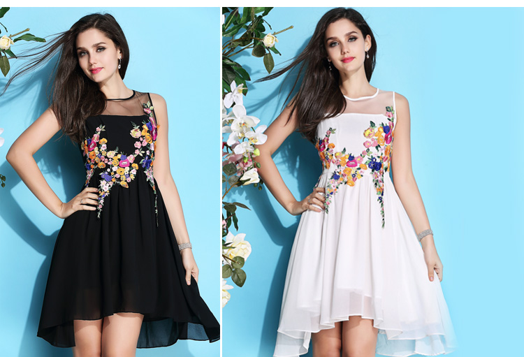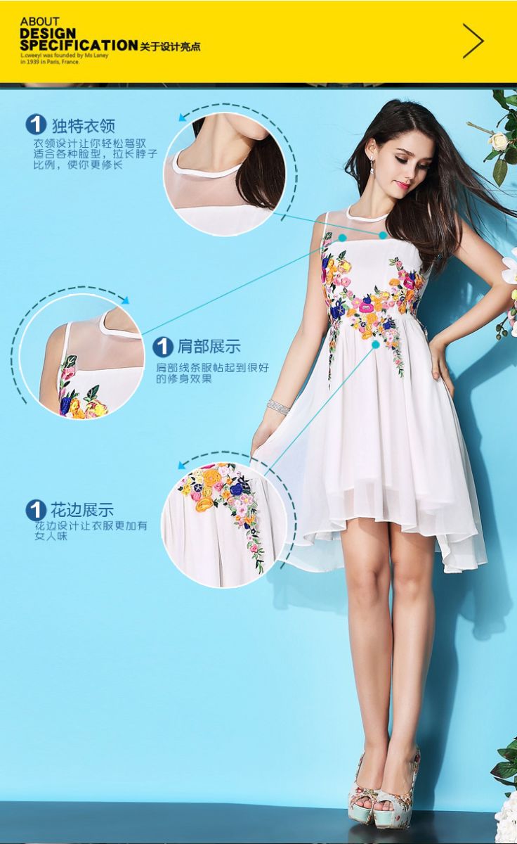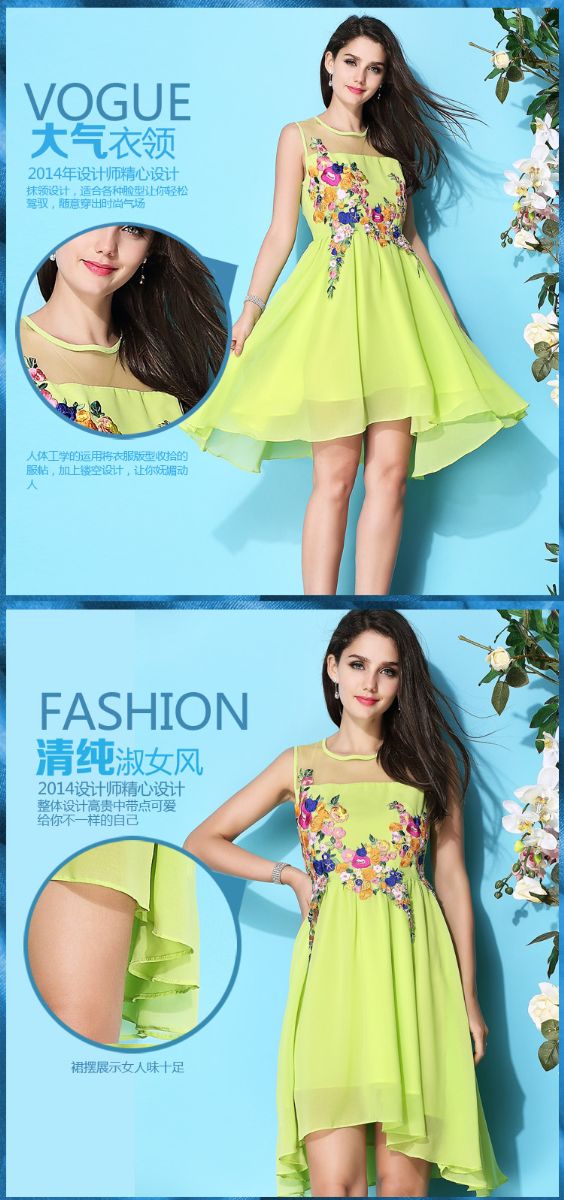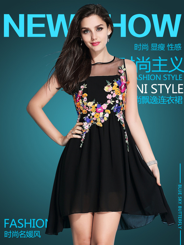 > 2015春夏新款无袖雪纺连衣裙刺绣高腰修身燕尾裙