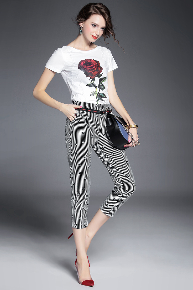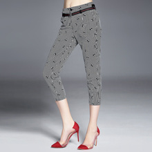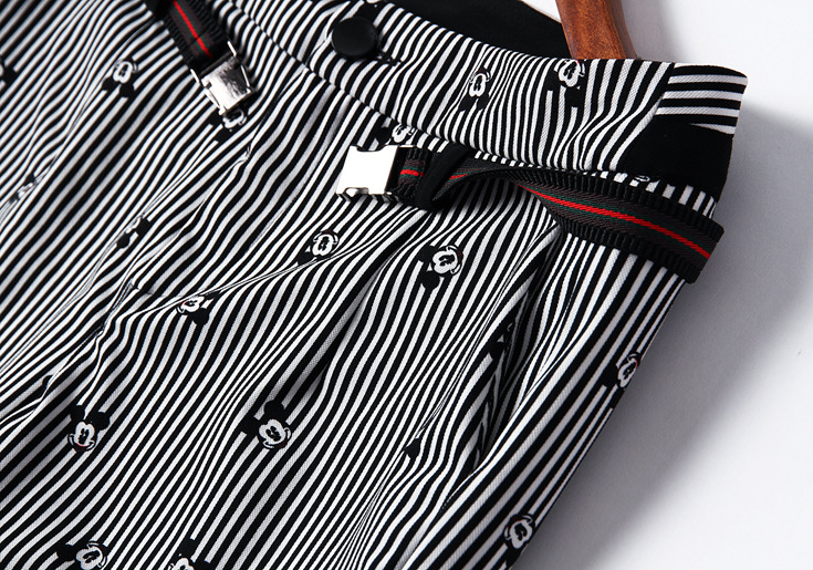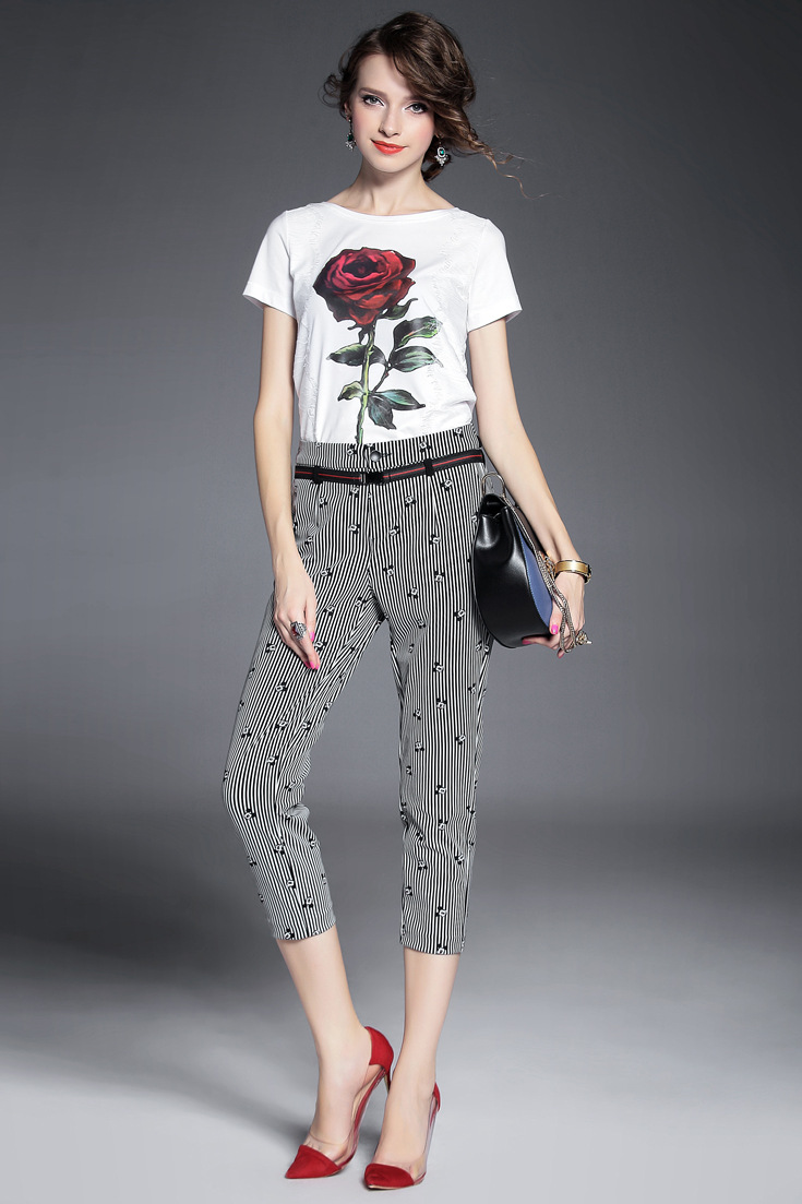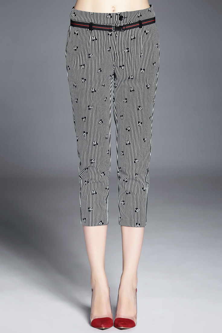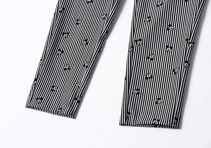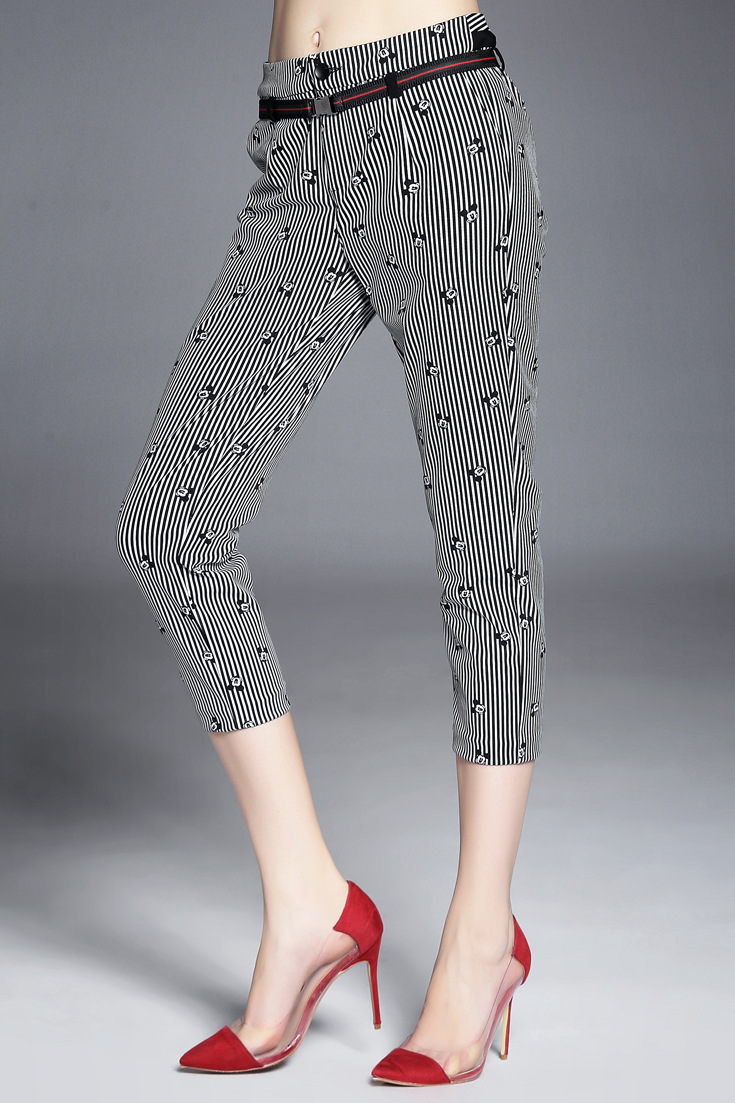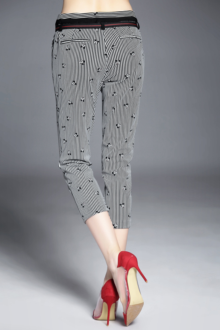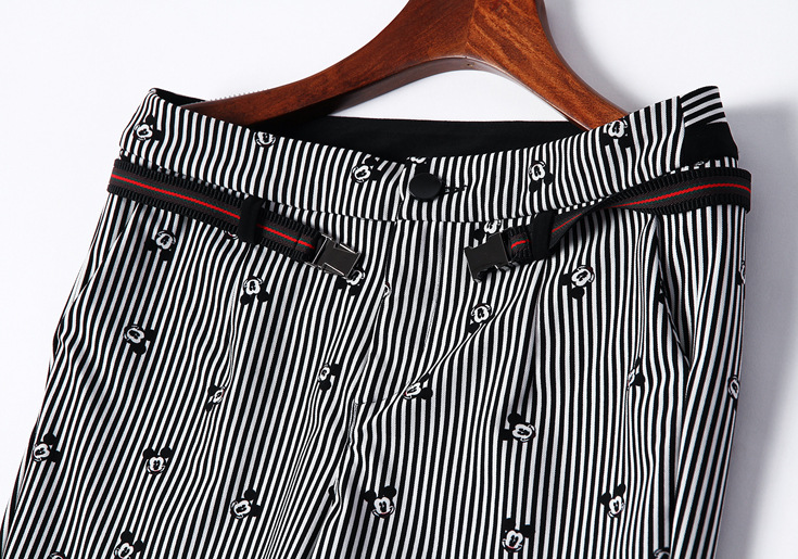 > 2015欧洲站夏季女装 米奇绣花竖条纹修身显瘦休闲裤七分小脚裤女