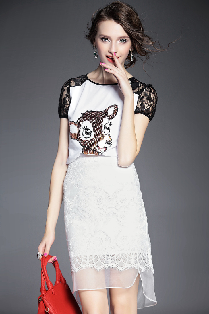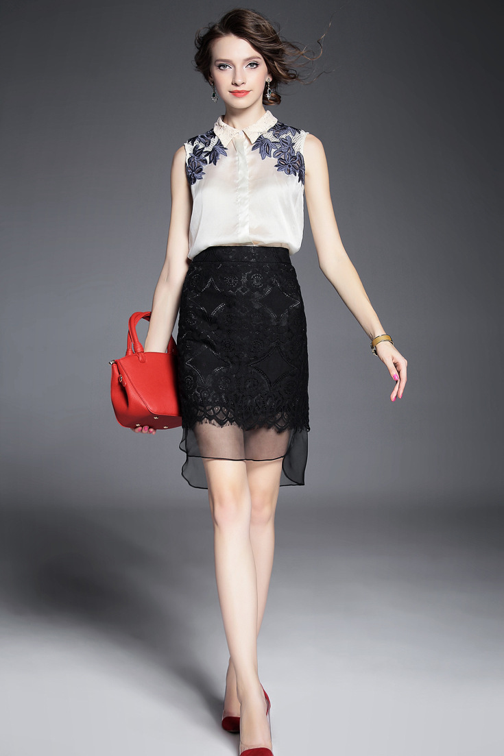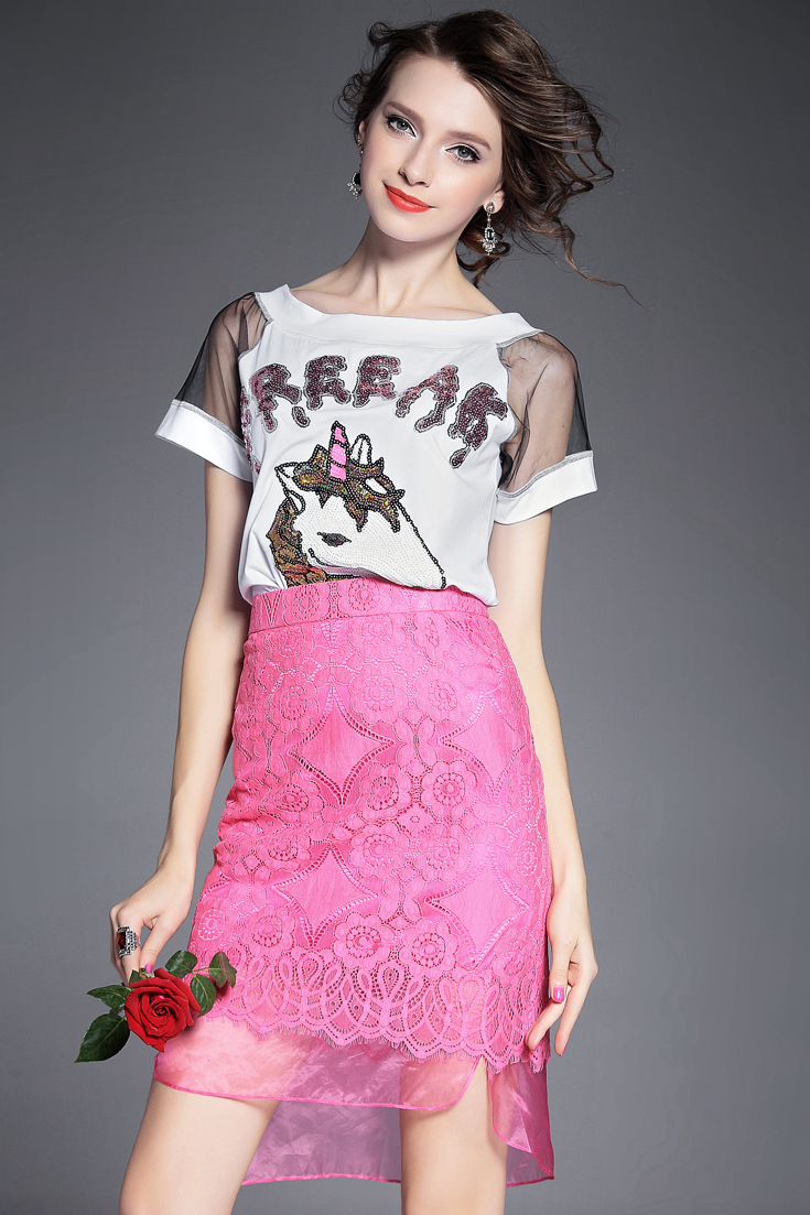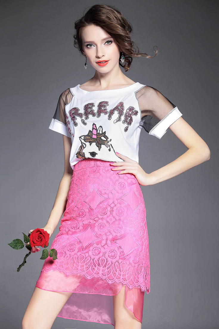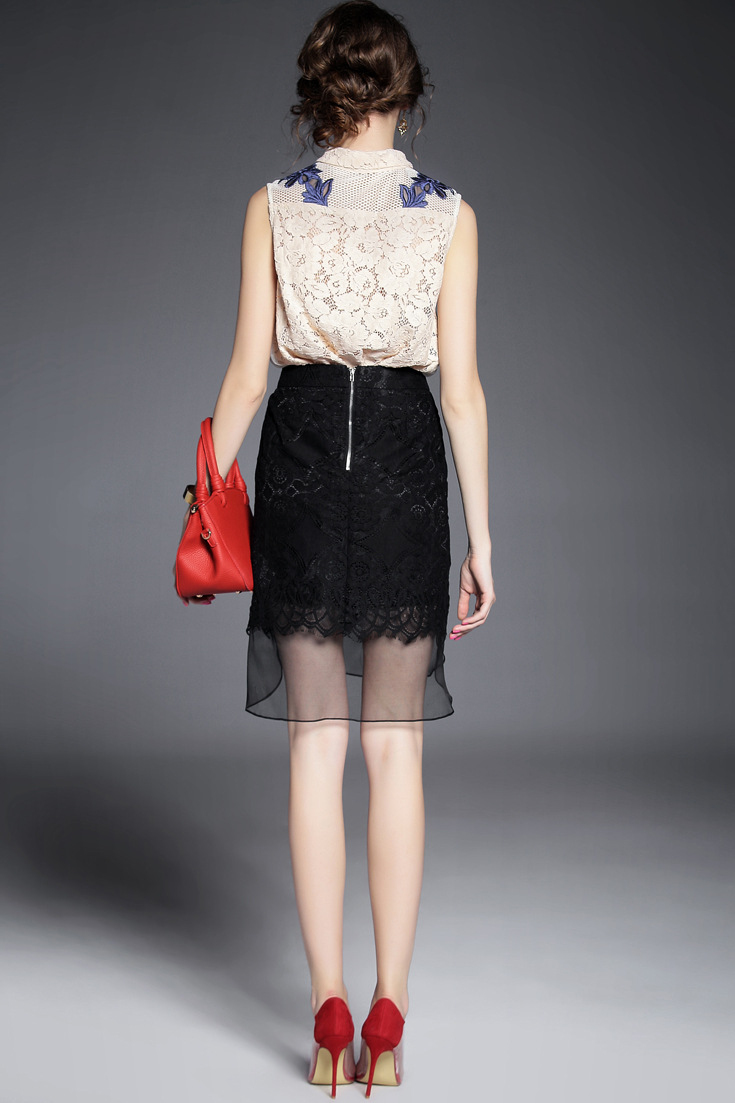 > 2015夏 纯色蕾丝真丝欧根纱拼接修身包臀不规则半身裙