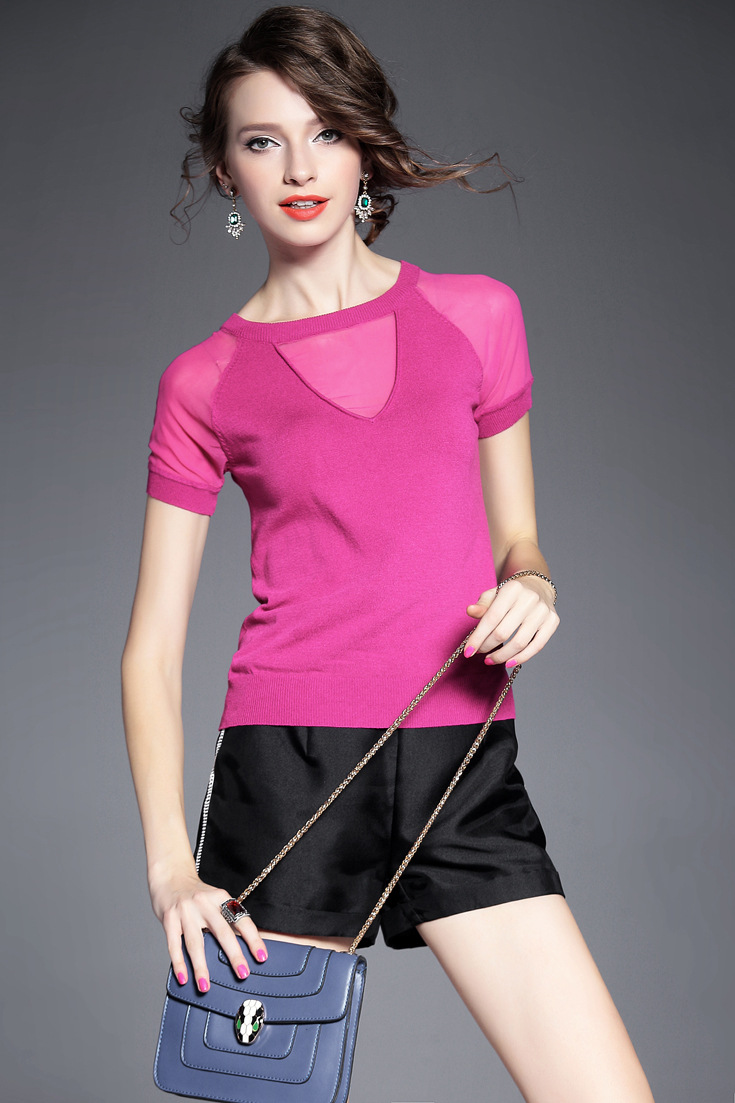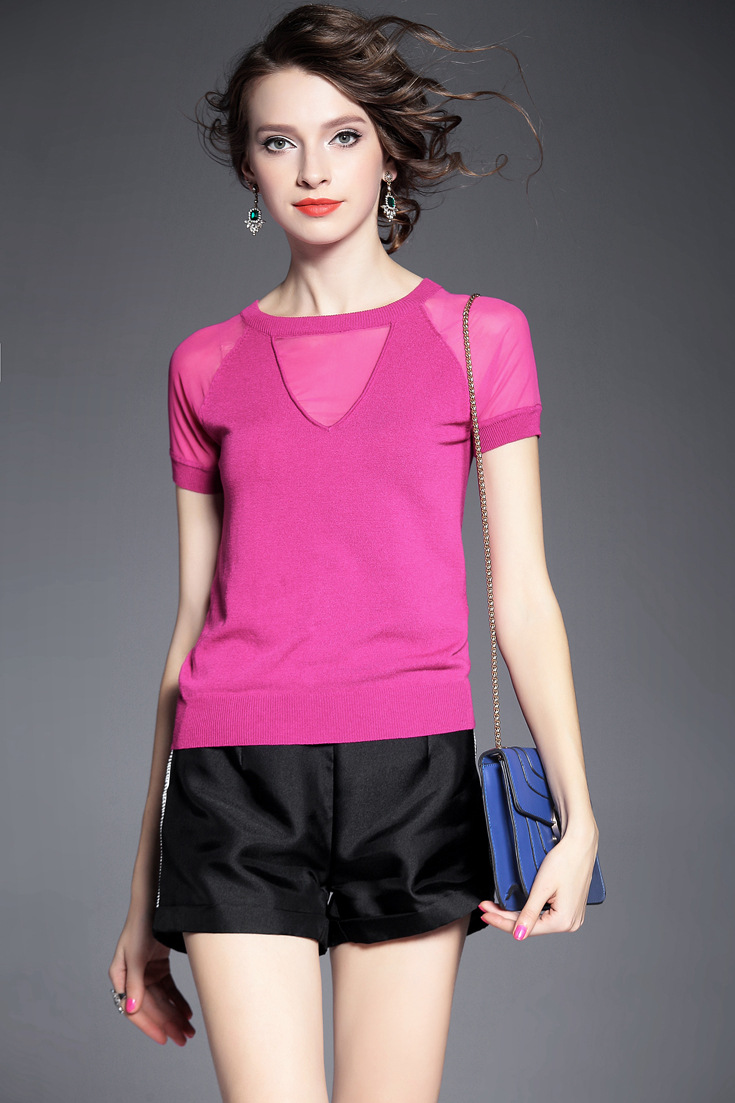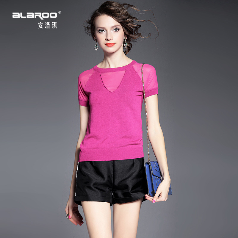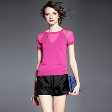 > 2015品牌女装新款 欧美时尚圆领短袖弹力针织拼接纯色修身女T恤