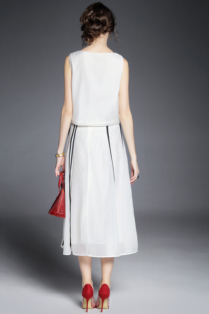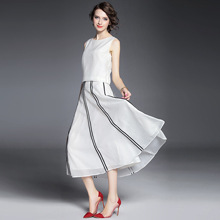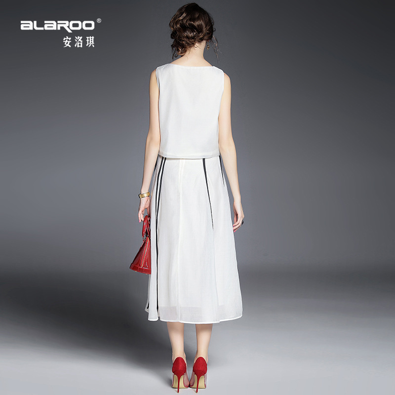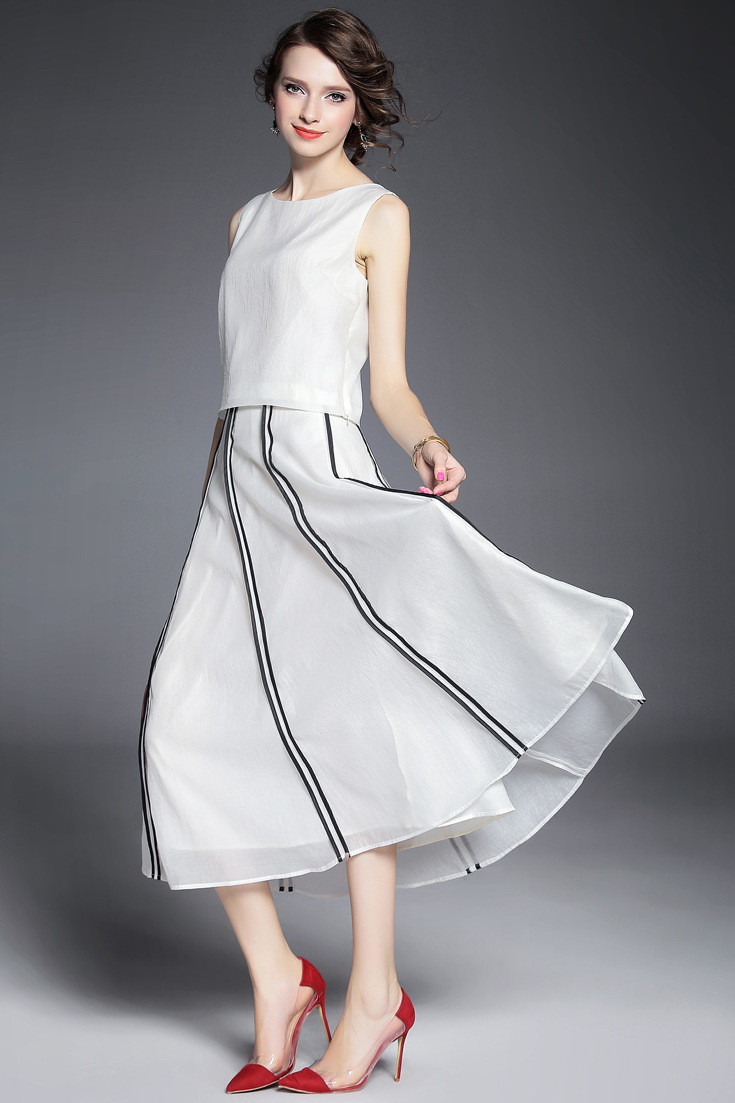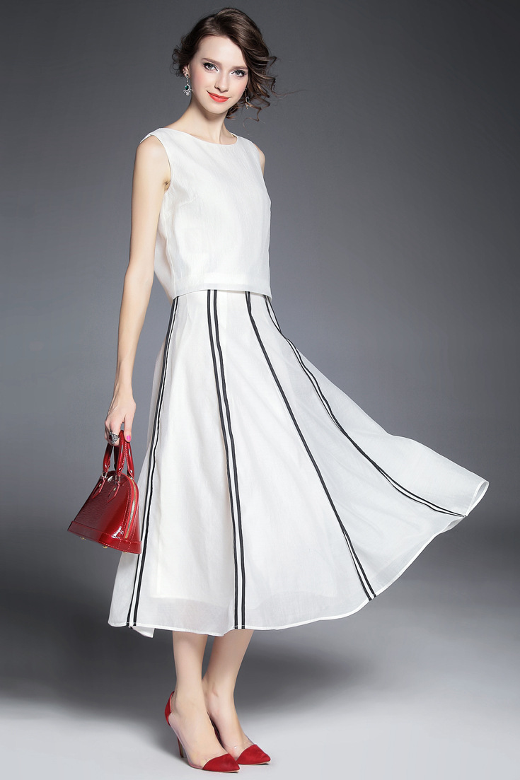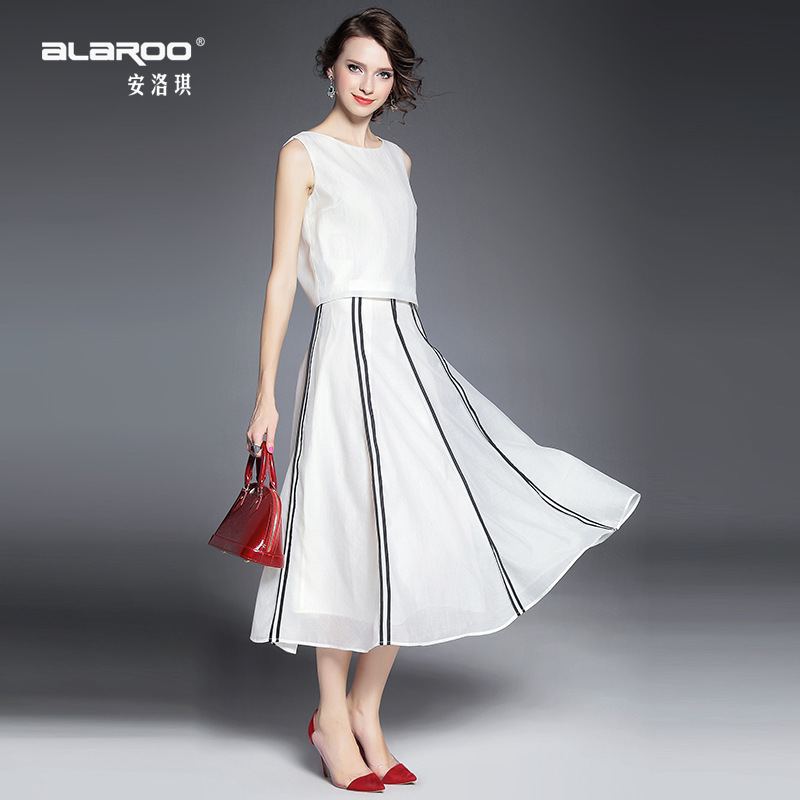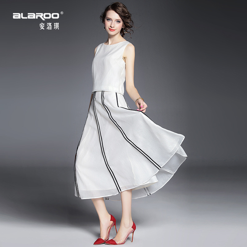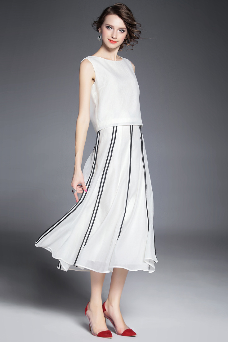 > 2015夏新品 欧美大牌纯色无袖短上衣+条纹拼接高腰中长半裙套装