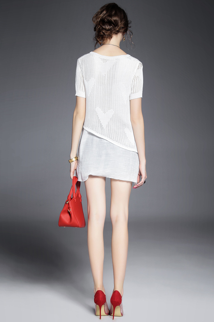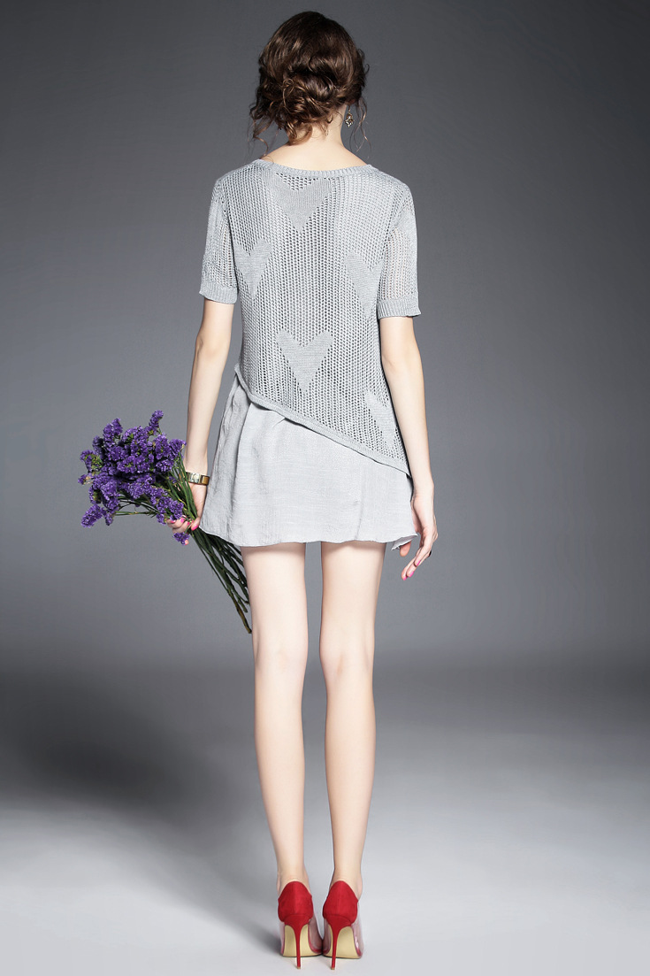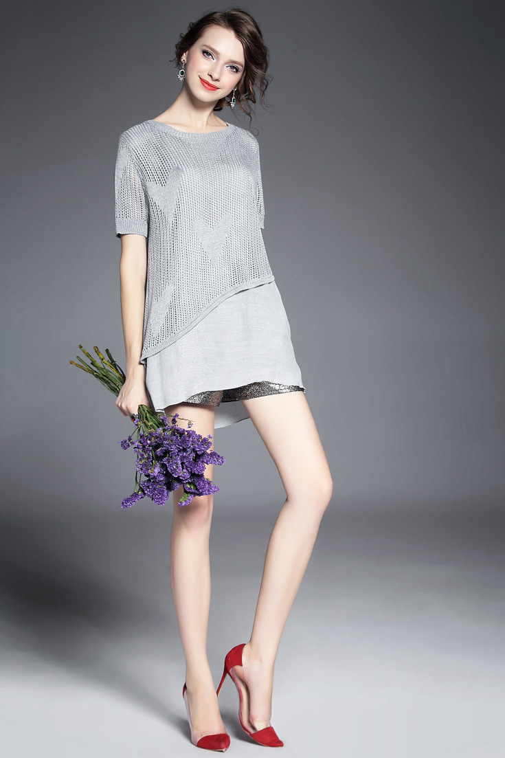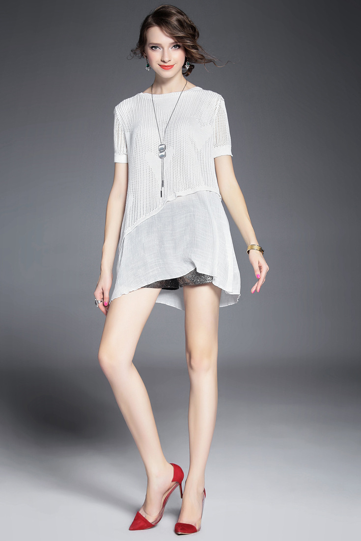 > 2015夏季新款 时尚圆领套头纯色亚麻拼接不规则中长针织T恤女