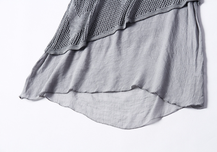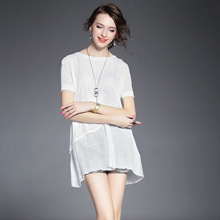 2015夏季新款 时尚圆领套头纯色亚麻拼接不规则中长针织T恤女