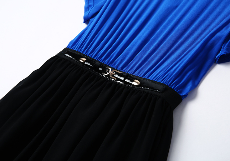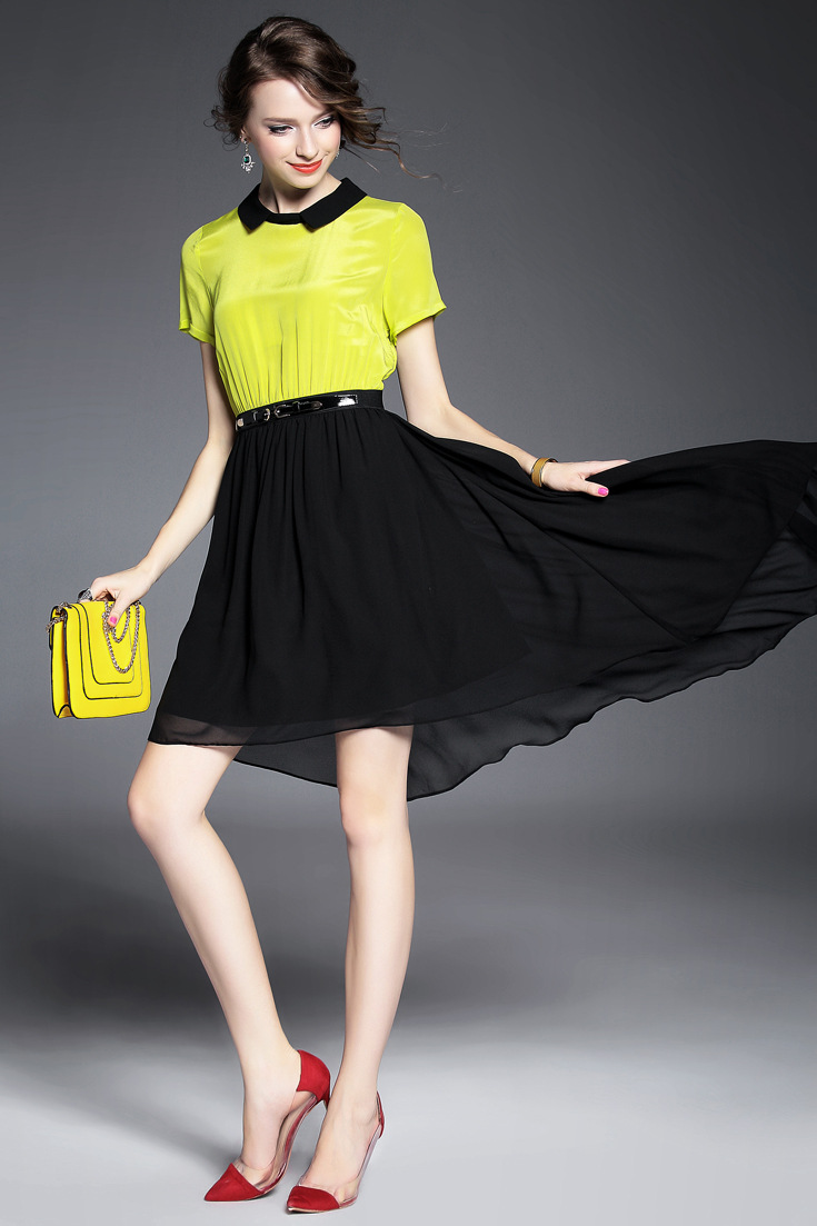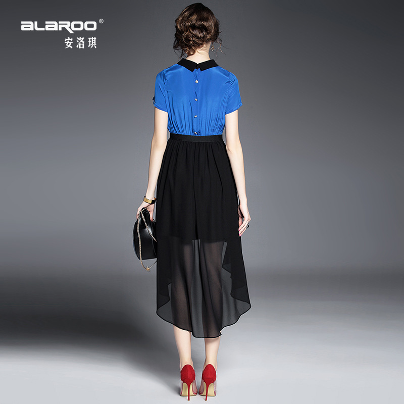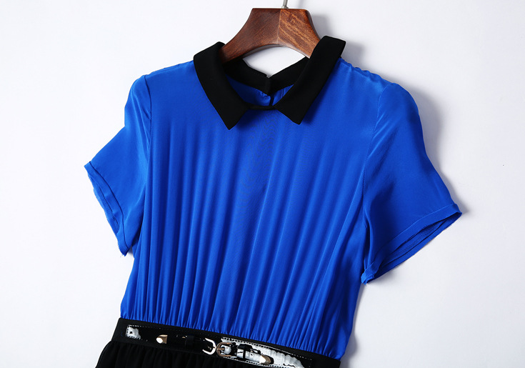 > 2015夏 小翻领单排扣弹力收腰撞色不规则真丝连衣裙