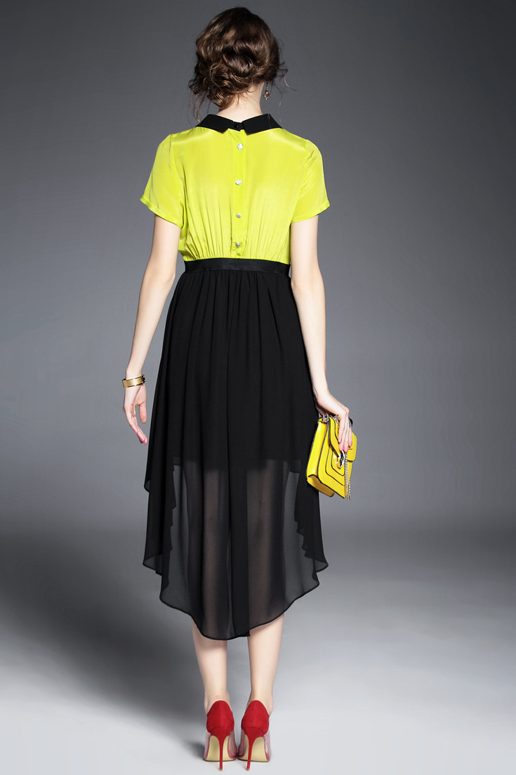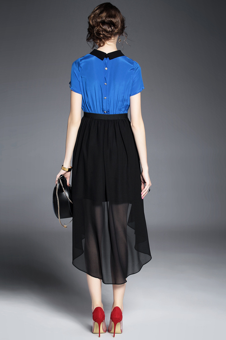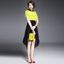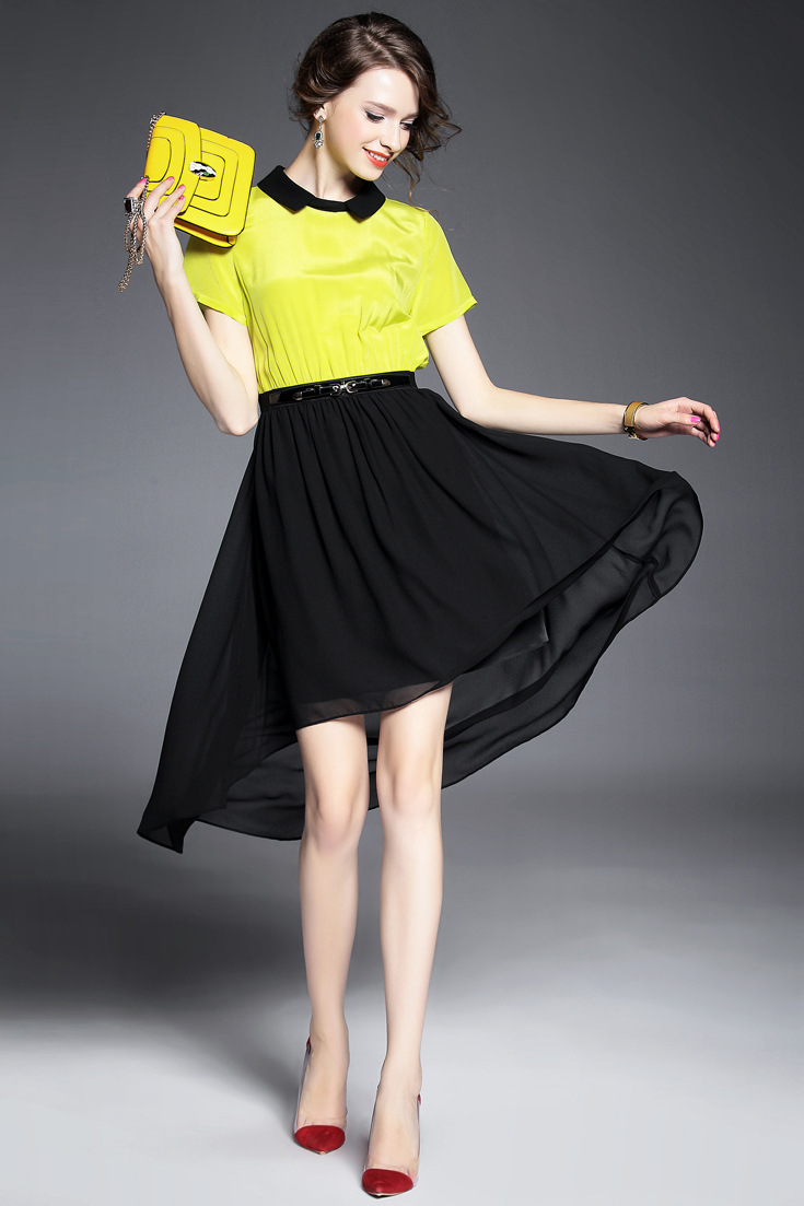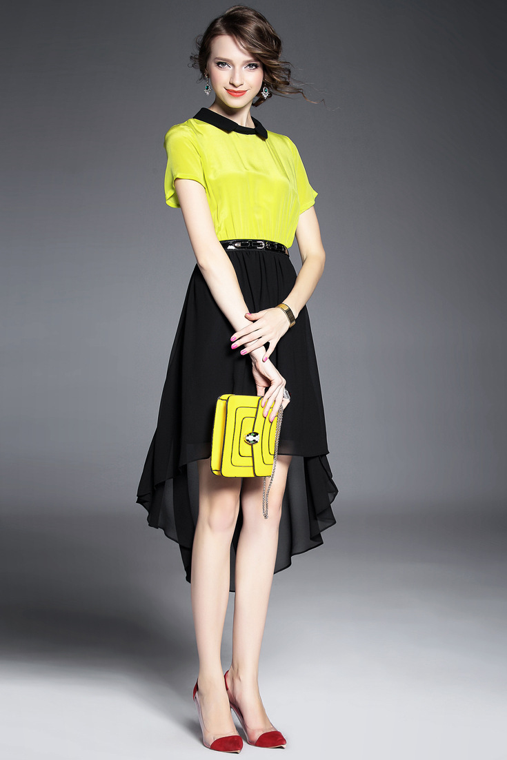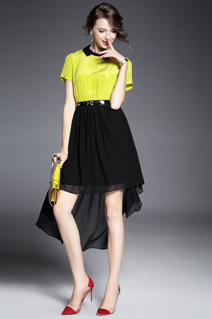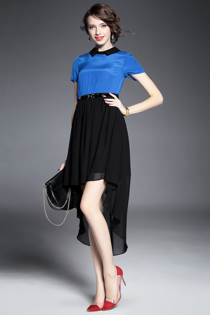 2015夏 小翻领单排扣弹力收腰撞色不规则真丝连衣裙