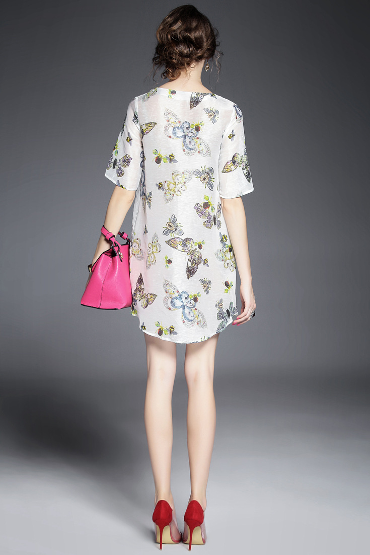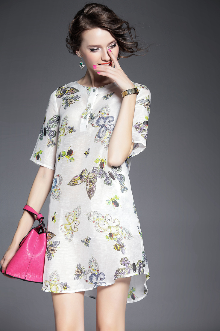 > 2015夏季新款 时尚圆领单排扣套头中袖亚麻印花连衣裙