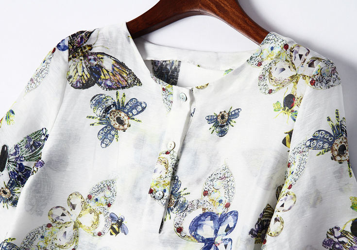 2015春夏季新款欧美风印花真丝连衣裙七分袖衬衣领时尚A字裙