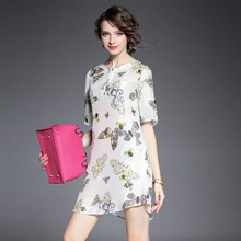 2015春夏新款欧美风印花高档桑蚕丝七分袖A字裙真丝连衣裙