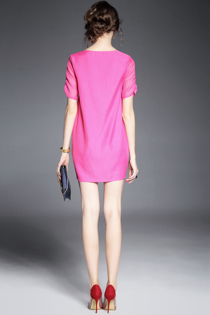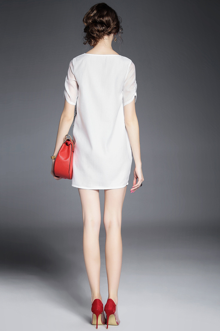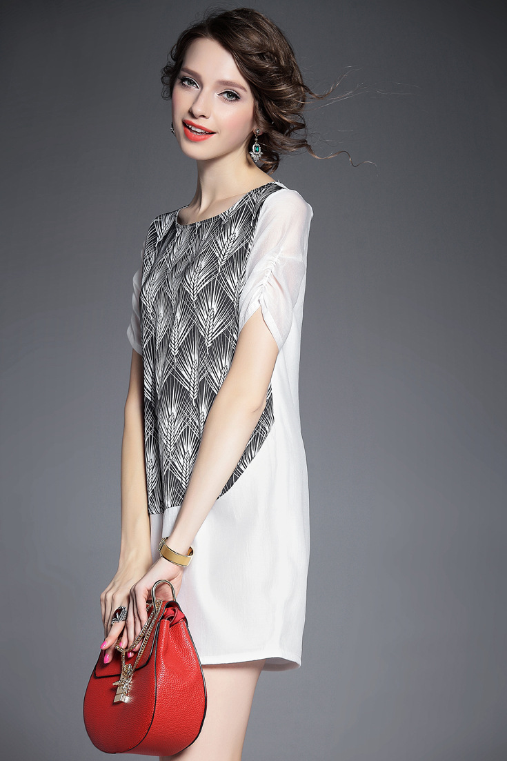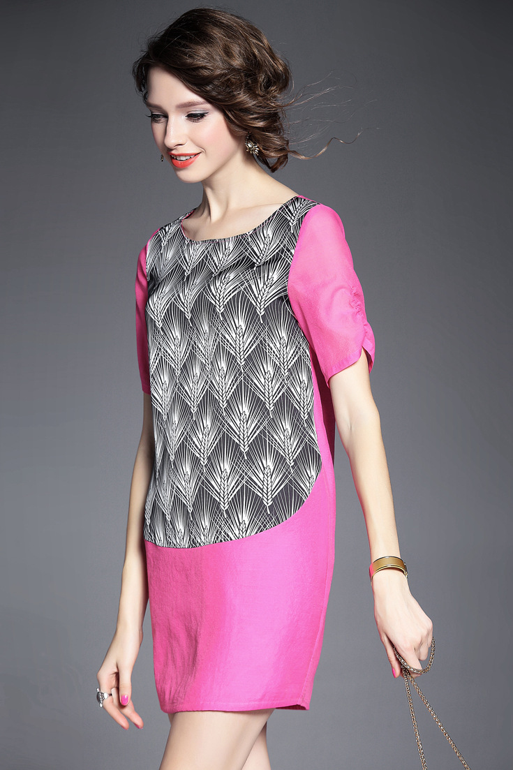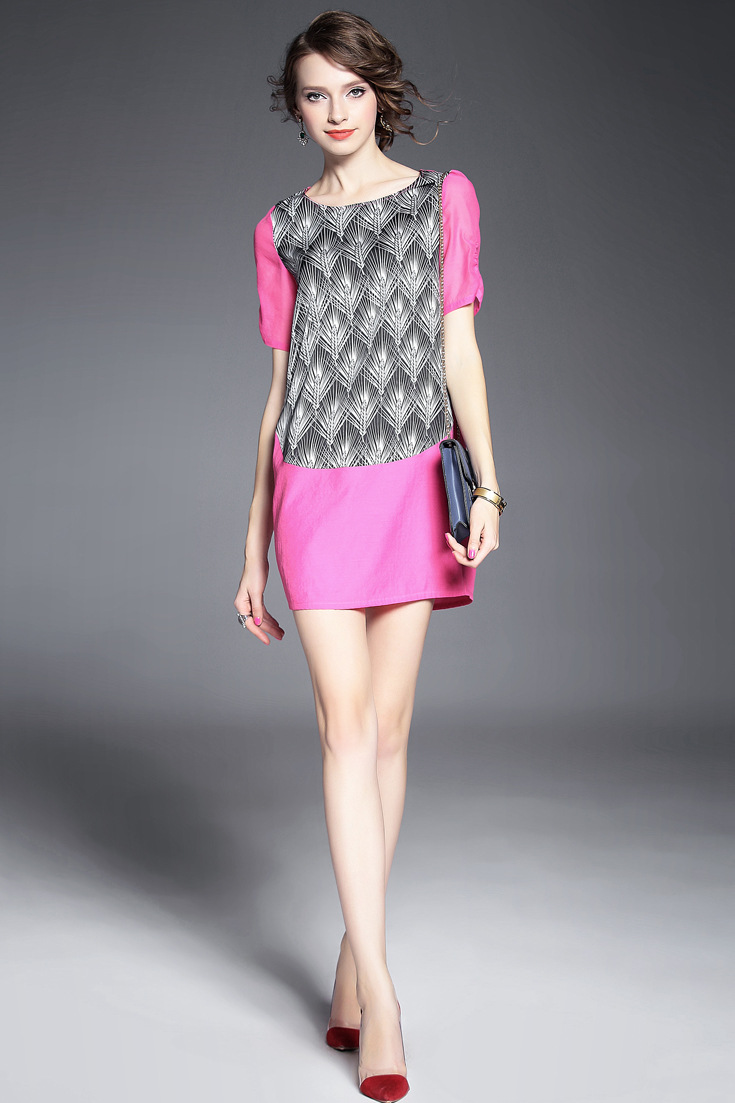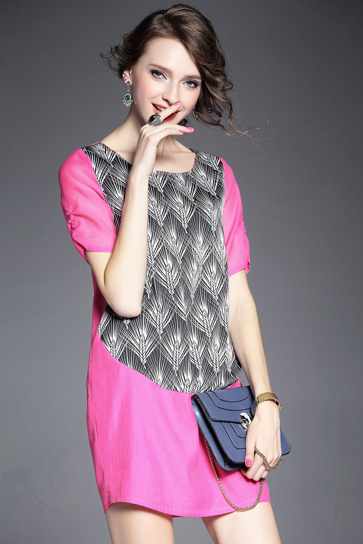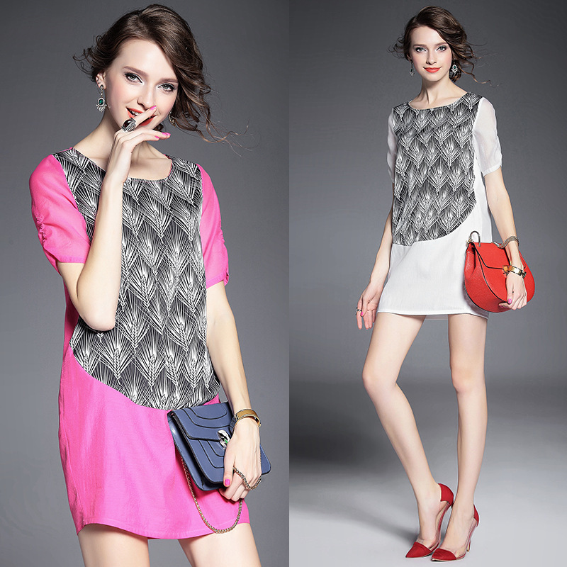 > 2015夏季新款女装 时尚圆领短袖印花拼接泡泡纱修身一步裙