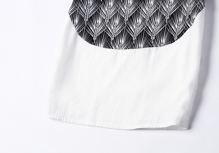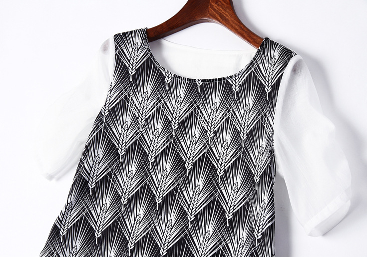 2015夏季新款女装 时尚圆领短袖印花拼接泡泡纱修身一步裙