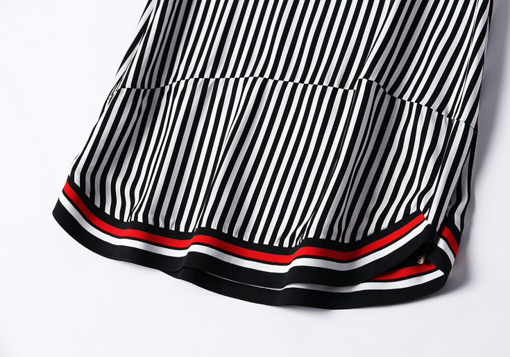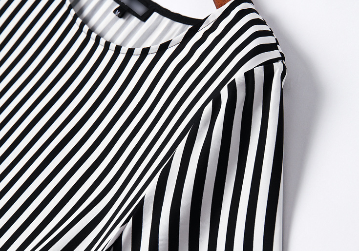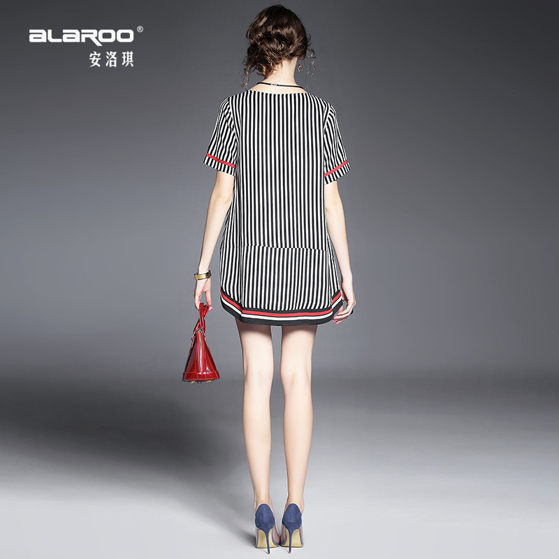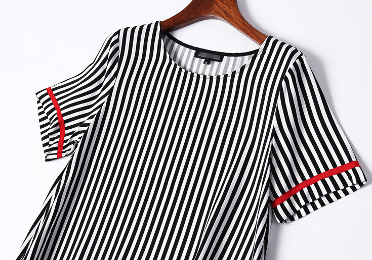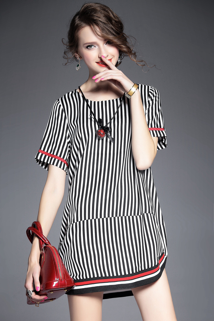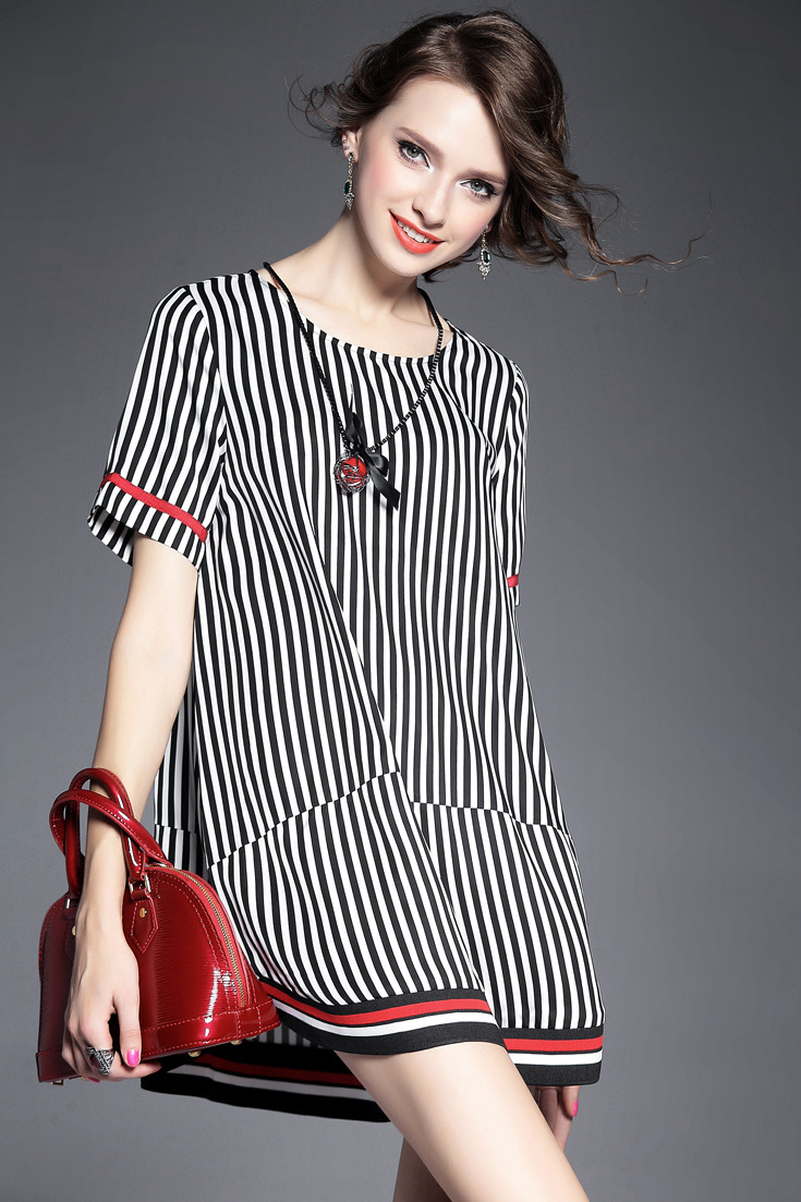 > 2015夏季新款 圆领短袖竖条纹螺纹拼接套头宽松茧型裙