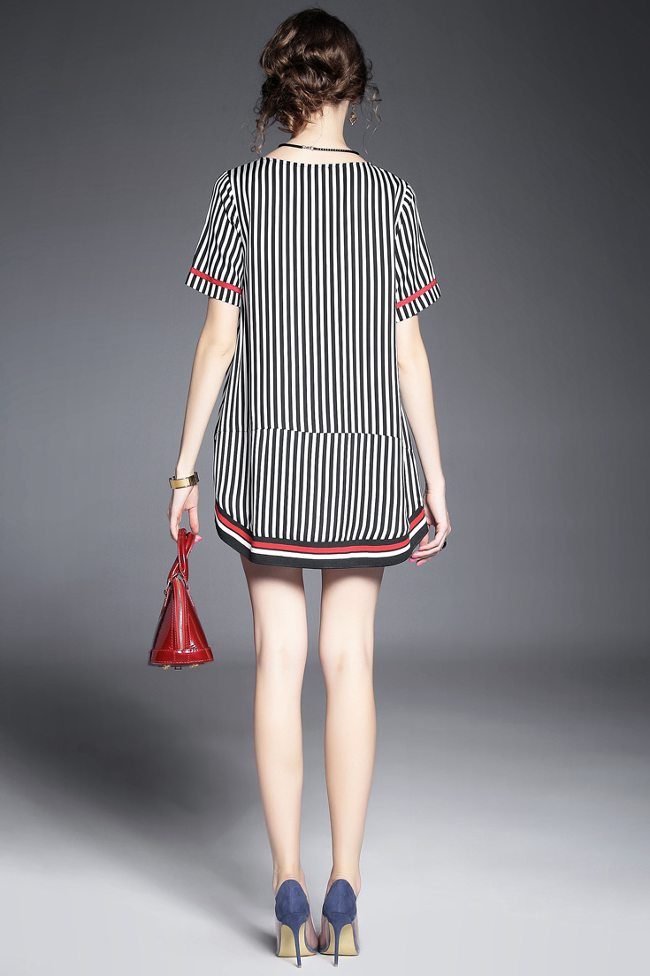 2015夏季新款 圆领短袖竖条纹螺纹拼接套头宽松茧型裙