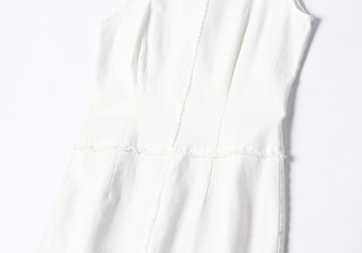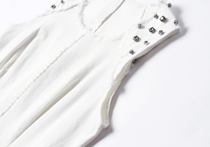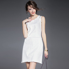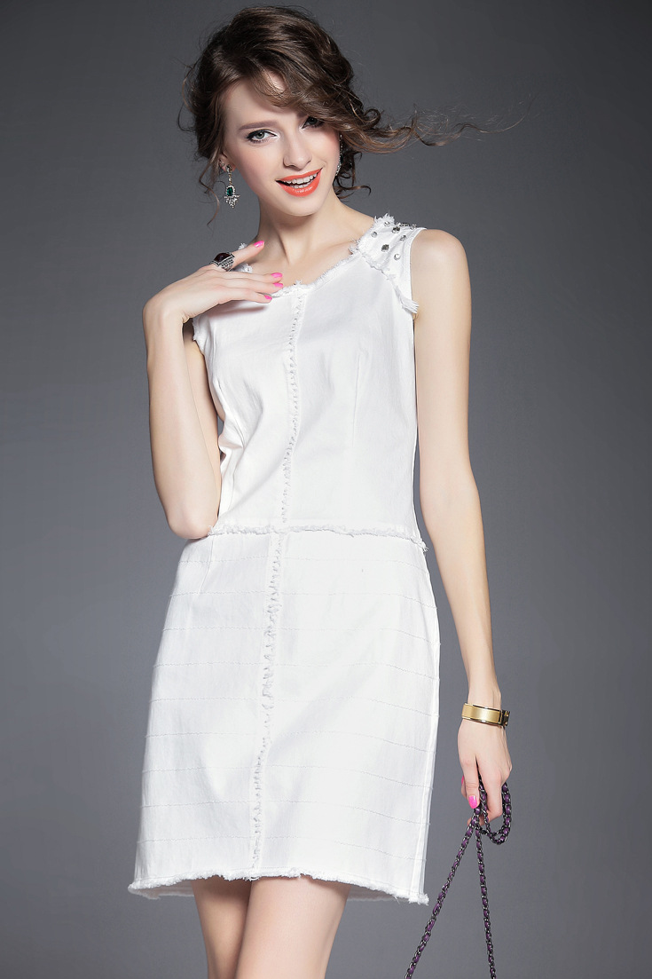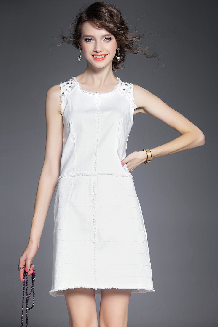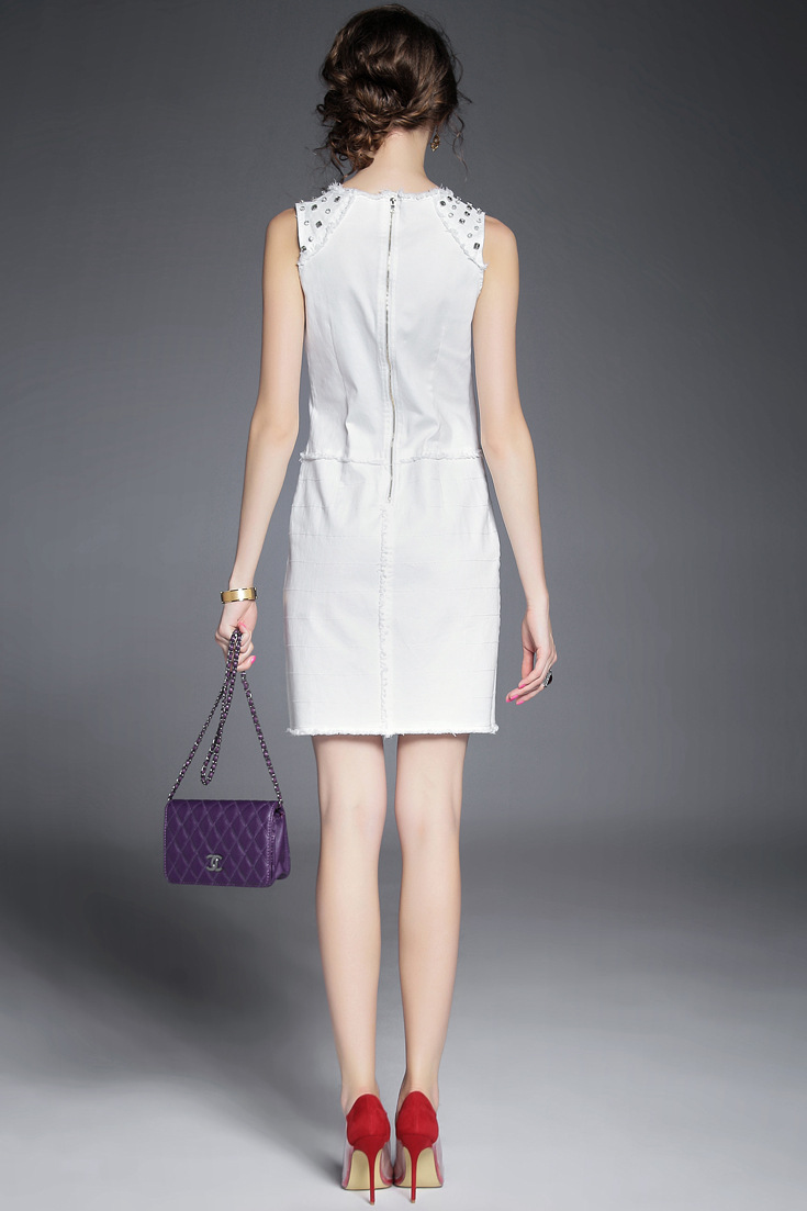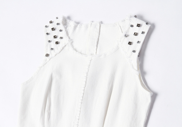 > 2015夏季新款时尚圆领肩部钉钻无袖纯色牛仔裙修身一步裙