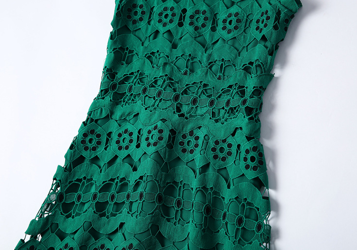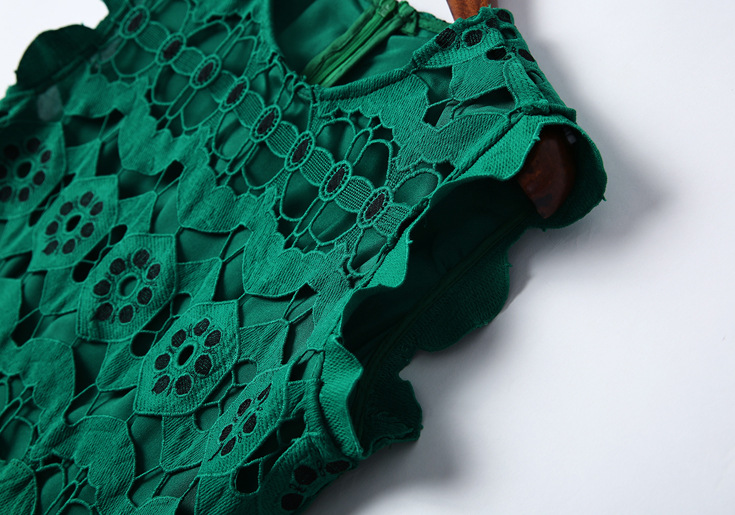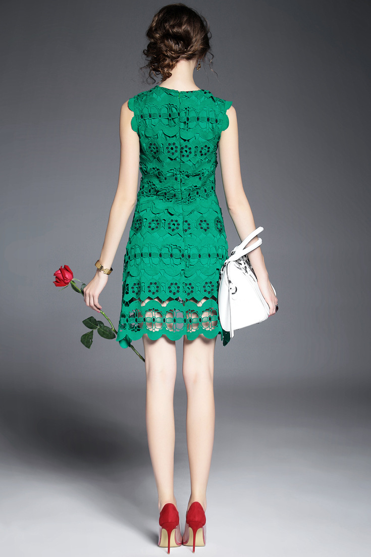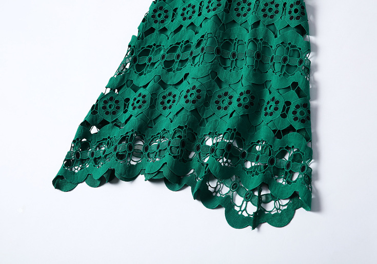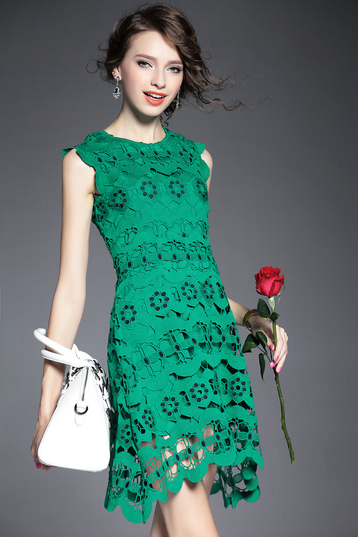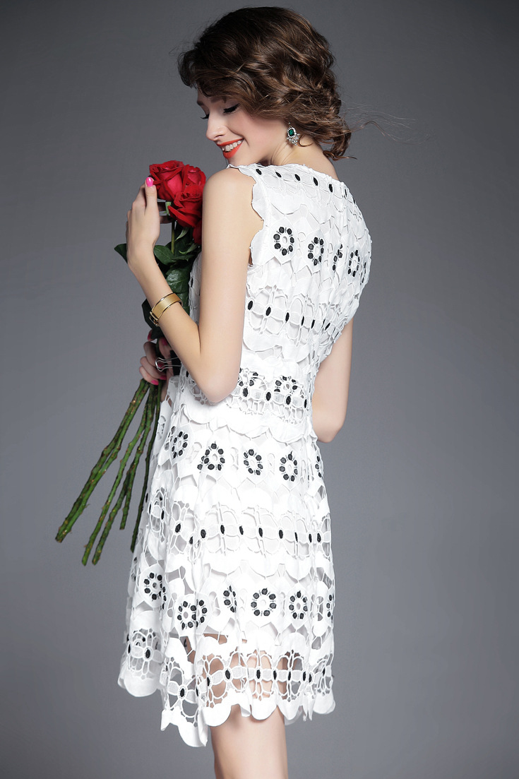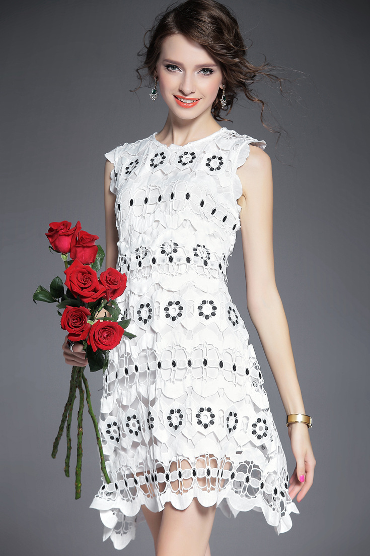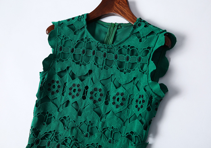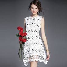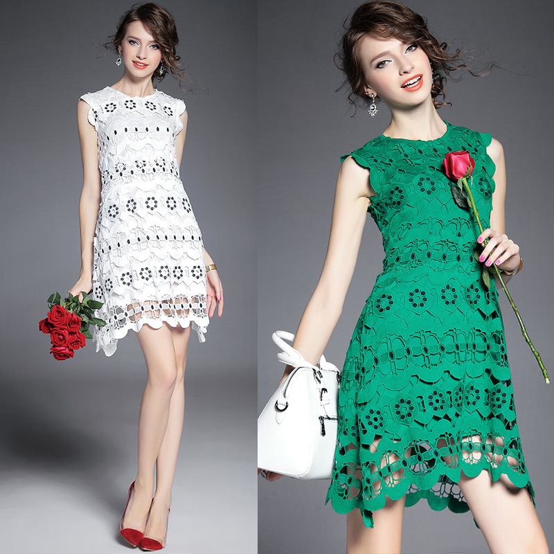 > 2015夏季女装新款 圆领无袖水溶绣花镂空纯色修身不规则一步裙子