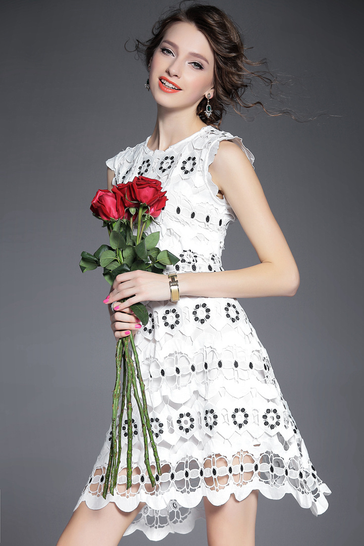 2015夏季女装新款 圆领无袖水溶绣花镂空纯色修身不规则一步裙子