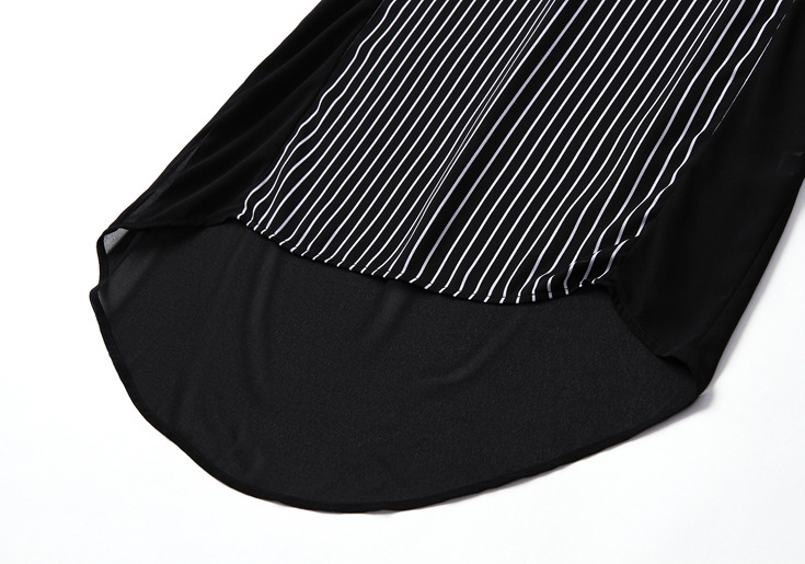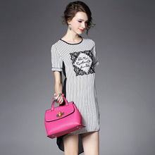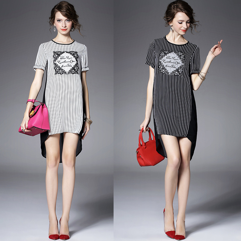 2015夏季女装 欧美大牌重工绣花气质竖条纹前短后长不规则连衣裙