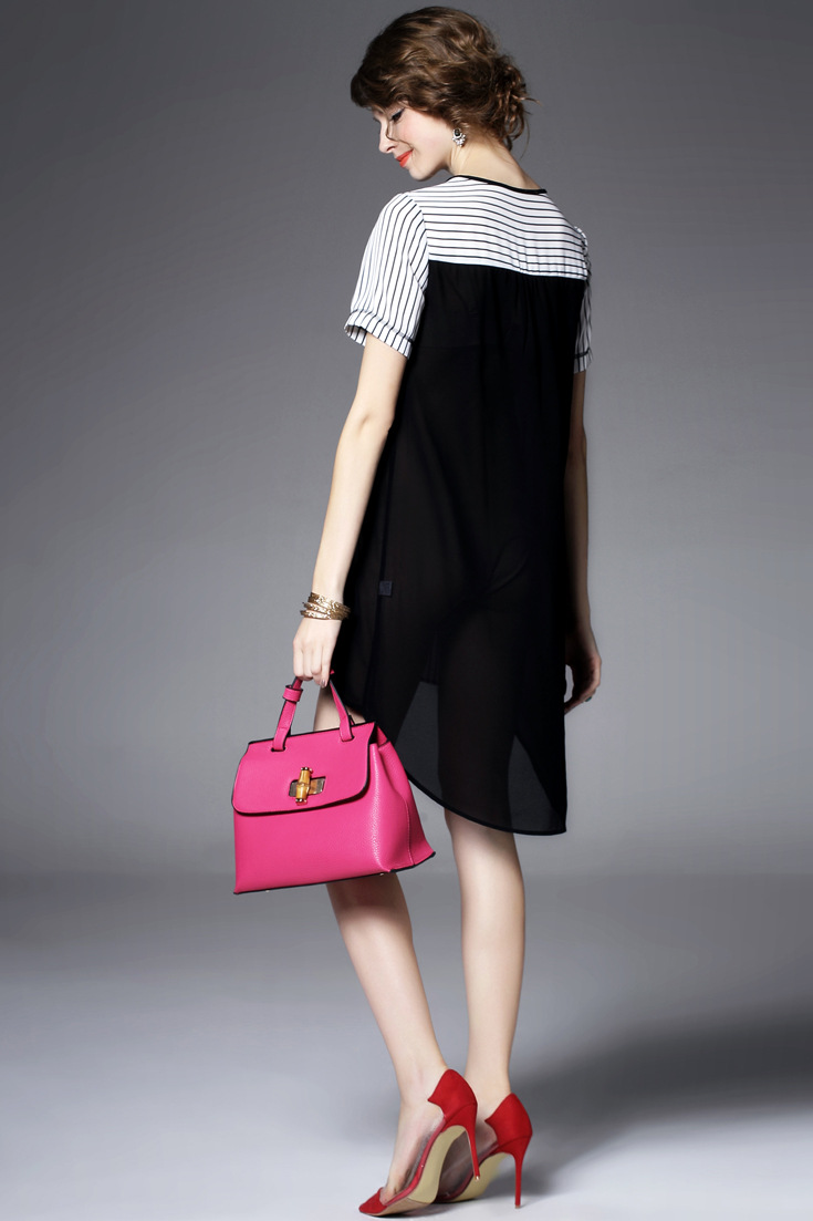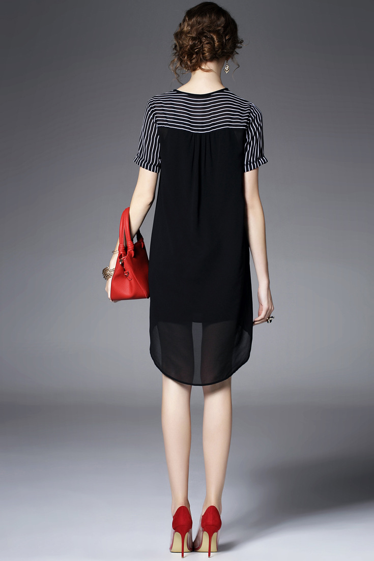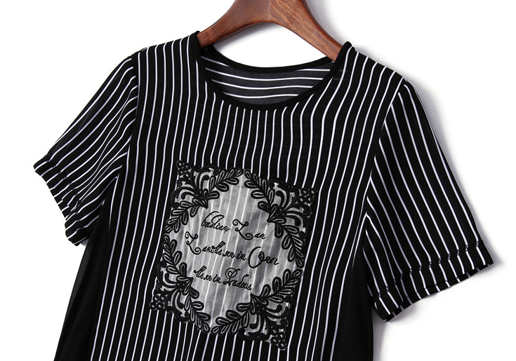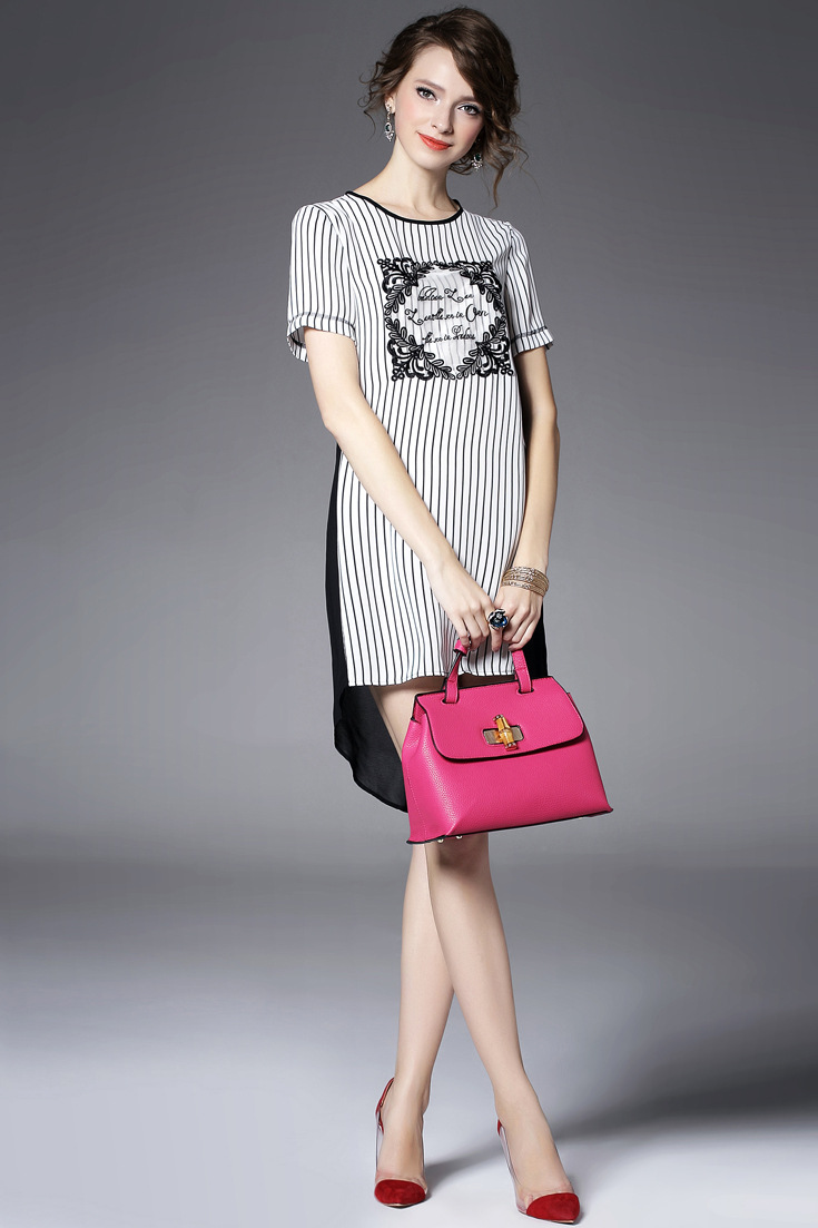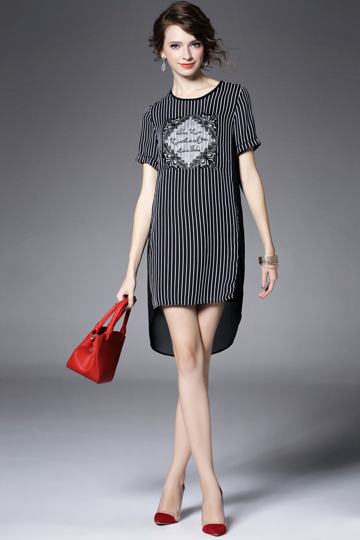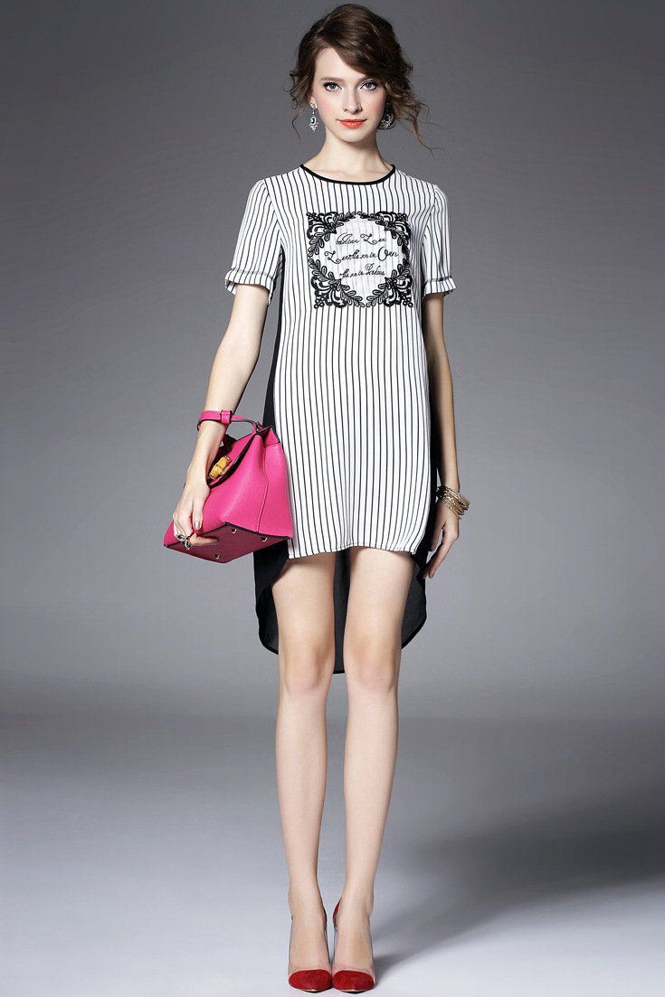 > 2015夏季女装 欧美大牌重工绣花气质竖条纹前短后长不规则连衣裙