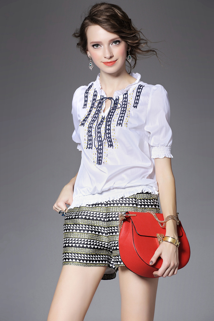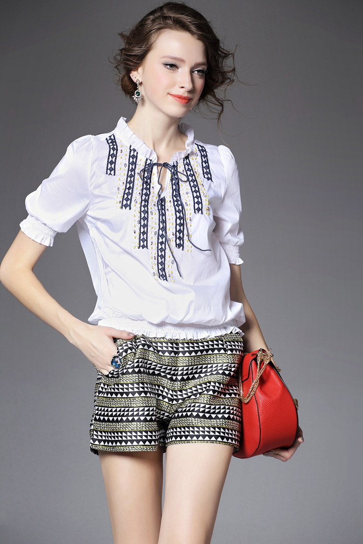 > 2015夏季新款 v领钉珠绣花拼贴修身短上衣+波浪纹阔腿短裤套装女